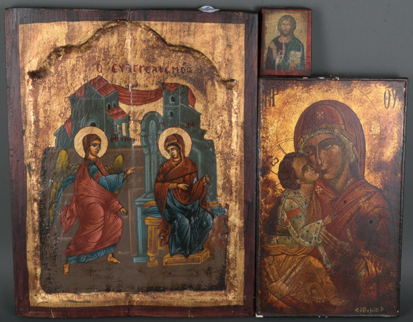 - Katalog-Nr: 526Drei Ikonen. Wohl Griechenland / Russland. Massivholz, bunt bemalt mit unterschiedlichen Heiligendarstellungen, 9,5 x7,5 bis 45,5 x 35 cm.o.L.