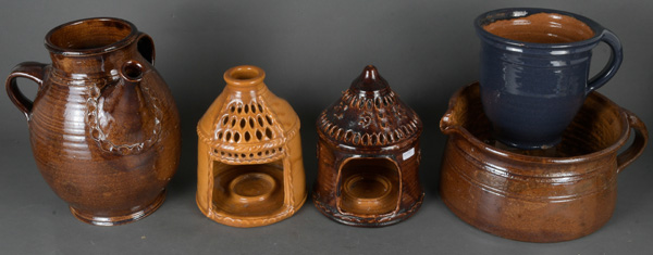 - Katalog-Nr: 530Jörg von Manz (1939-1997). Fünftlgs. Konvolut Keramikobjekte, teilw. glasiert. Bestehend aus: Ein Henkelkrug (H=26 cm), ein Henkeltopf (H=13 cm, D=25 cm), zwei Handleuchter (H=19,5 / 20 cm) und ein Übertopf (H=17,5 cm).o.L.