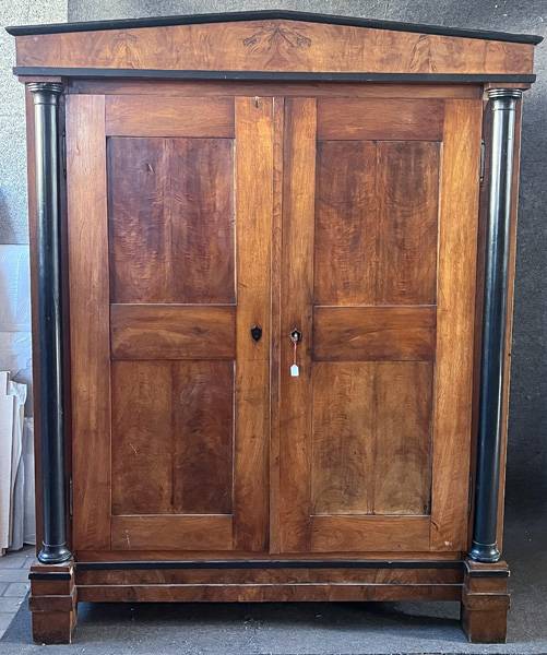 - Katalog-Nr: 532Biedermeier-Kleiderschrank. Deutsch 19. Jh. Nussbaum furniert, teilw. massiv und ebonisiert; auf vier Klotzfüßen stehend, zweitürige Front, flankiert von je einer vorgesetzten Halbsäule, Türen und Seiten in Füllung gearbeitet, Spitzgiebel mit drei Geheimfächern, H=220 cm, B=176 cm, T=69 cm. >>> Diese Los Nr. kann am Fr., den 10.04.26 (10.00 h bis 12.00 h) in unserem Depot in Mannheim abgeholt werden.o.L.