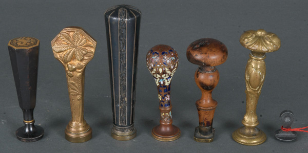 - Katalog-Nr: 534Siebentlgs. Konvolut Petschaften. England / Deutschland 19./20. Jh. Bronze / Email / Holz / Silber, H=2,2 bis 9,7 cm.o.L.