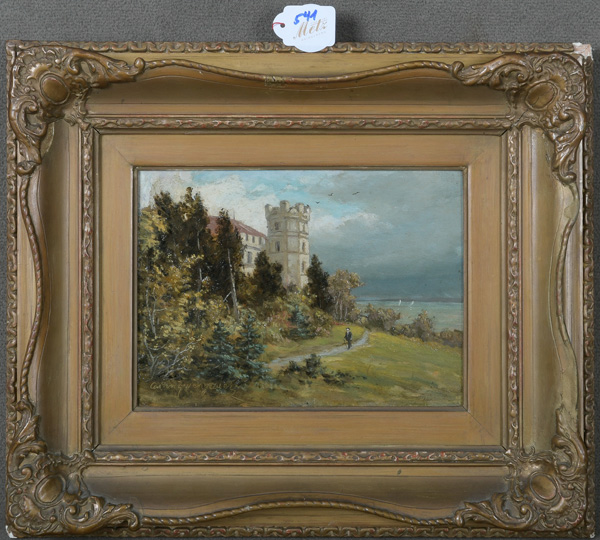 - Katalog-Nr: 541Anton Georg Zwengauer (1850-1928). Burgansicht mit Personenstaffage und See. Öl/Holz, li./u./sign., gerahmt, 15 x 21 cm.o.L.
