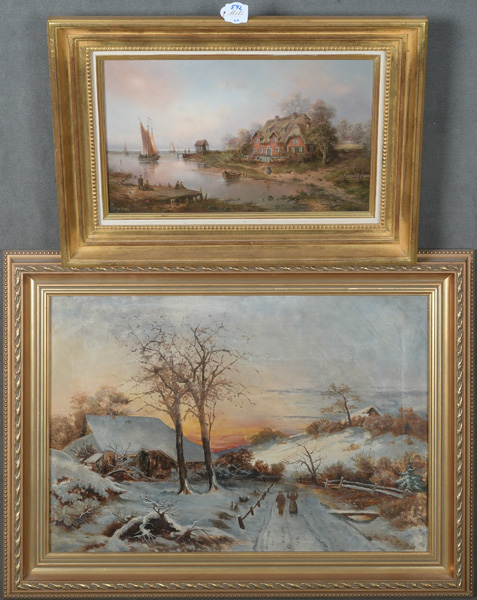 - Katalog-Nr: 542Peter May (*1926). Uferlandschaft mit Steg, Booten und Personenstaffage. Öl/Holz, li./u./sign., gerahmt (25 x 40 cm); dazu Maler des 20. Jhs. Winterlandschaft mit Personenstaffage. Öl/Lw., gerahmt, 41 x 59,5 cm.o.L.
