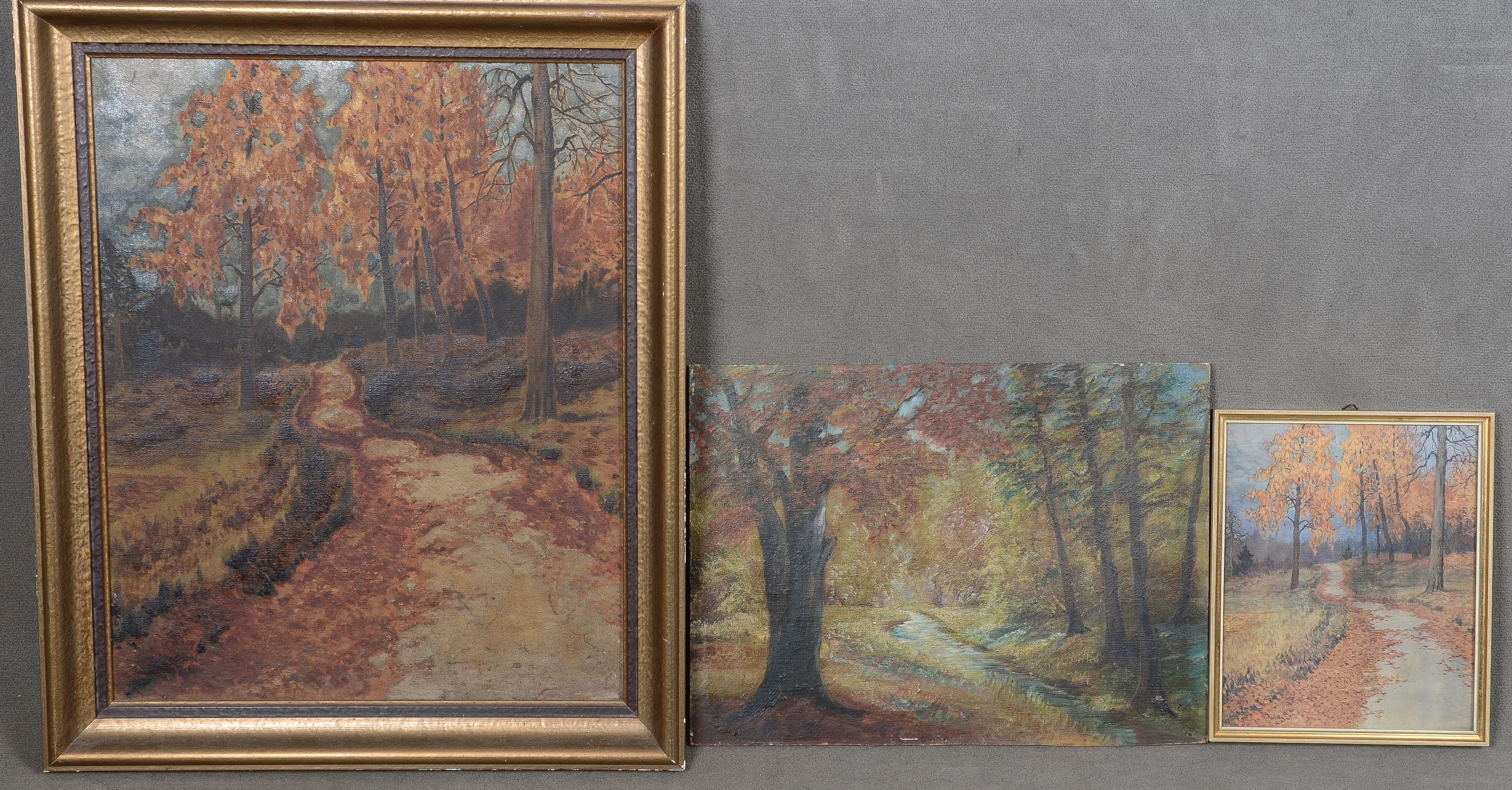 - Katalog-Nr: 676Maler des 20. Jhs. Zwei Waldlandschaften und ein Rahmen. Öl/Lw. bzw. Öl/Hartfaser, eine gerahmt, 23 x 19 bis 49 x 40 cm.o.L.