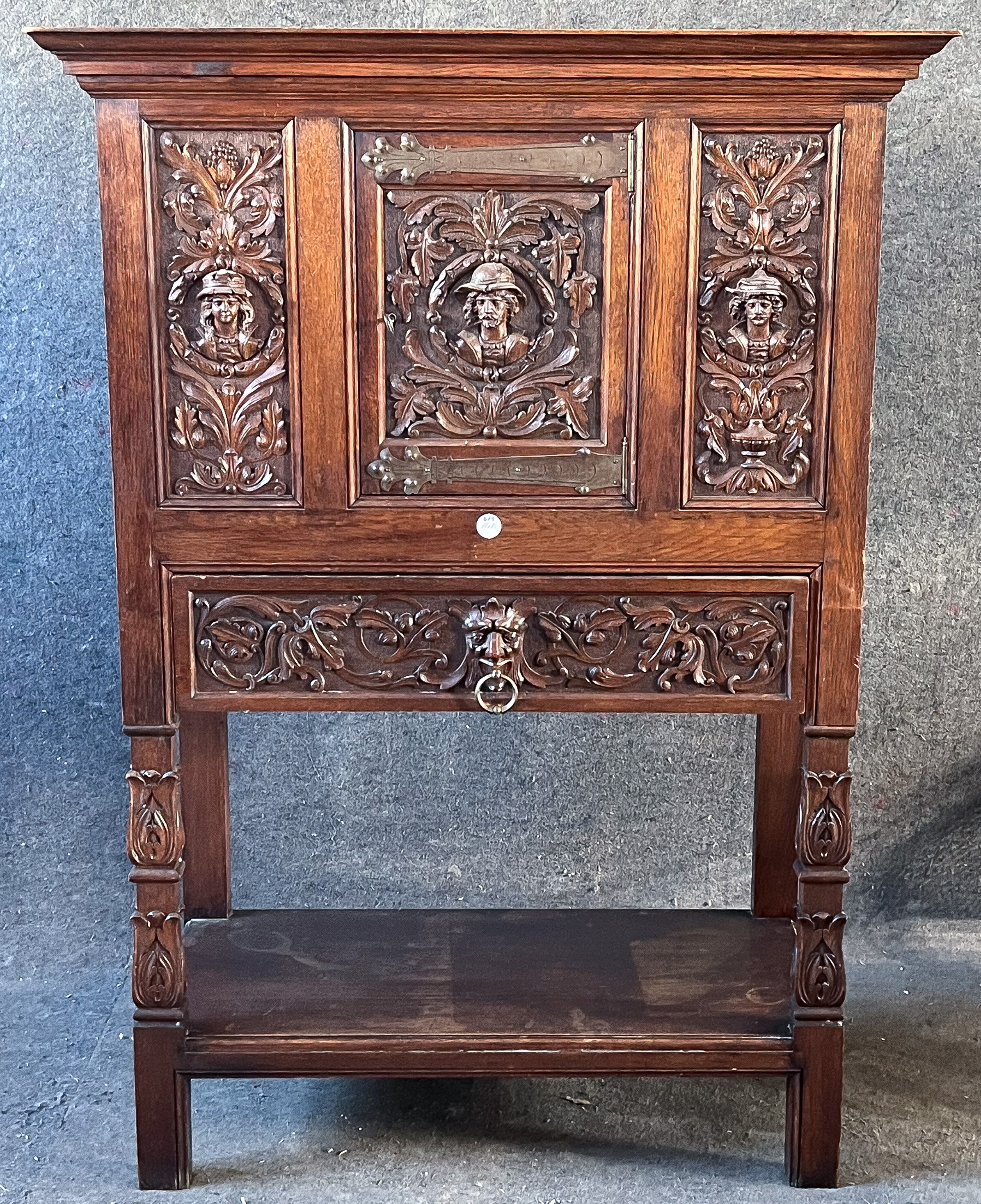 - Katalog-Nr: 679Historismus-Stollenschrank. Deutsch um 1900. Massiv Eiche, aufwendig geschnitzt mit Maskaronen, Fratze, Rocaillen, Vasen und Blüten, an den Seiten befindet sich Faltwerk, auf vier teilweise verzierten Klotzsäulen stehend, Mittelbrett, darüber ein Schub, eintürige Front und Seiten in Füllung gearbeitet, profiliertes Abschlussgesims, schmiedeeiserne Beschläge, H=150 cm, B=107 cm, T=49 cm. >>> Diese Los Nr. kann am Fr., den 10.04.26 (10.00 h bis 12.00 h) in unserem Depot in Mannheim abgeholt werden.o.L.