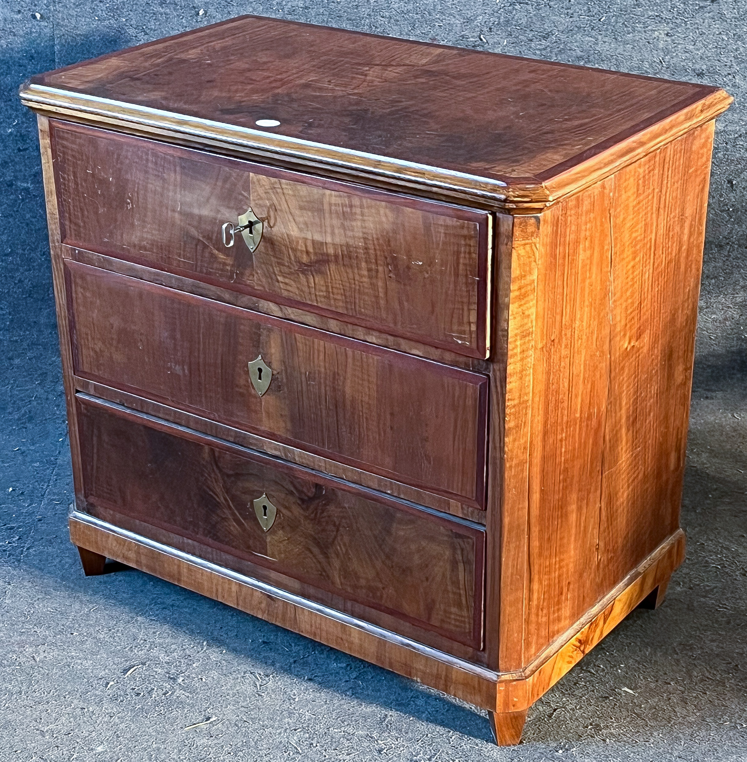 - Katalog-Nr: 684Spätbiedermeier-Kommode. Deutsch 19. Jh. Nussbaum / Mahagoni furniert mit Messingbeschlägen; vier Spitzfüße, dreischübig, abgeschrägte Kanten, gerade Sockelleiste, profilierte Platte, H=80 cm, B=85 cm, T=52 cm. (mit Ergänzungen) >>> Diese Los Nr. kann am Fr., den 10.04.26 (10.00 h bis 12.00 h) in unserem Depot in Mannheim abgeholt werden.o.L.
