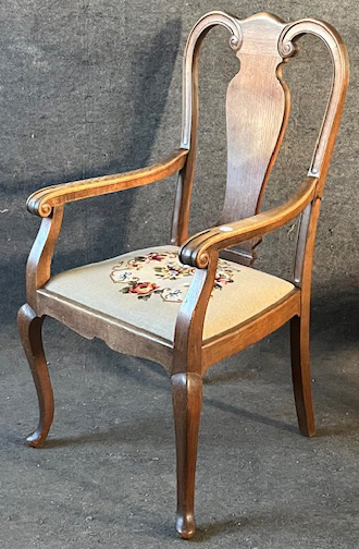 - Katalog-Nr: 691Armlehnsessel im Chippendale-Stil. Deutsch 20 Jh. Massiv Eiche mit geschwungenem Gestell, Mittelzunge und besticktem Bezug. >>> Diese Los Nr. kann am Fr., den 10.04.26 (10.00 h bis 12.00 h) in unserem Depot in Mannheim abgeholt werden.o.L.