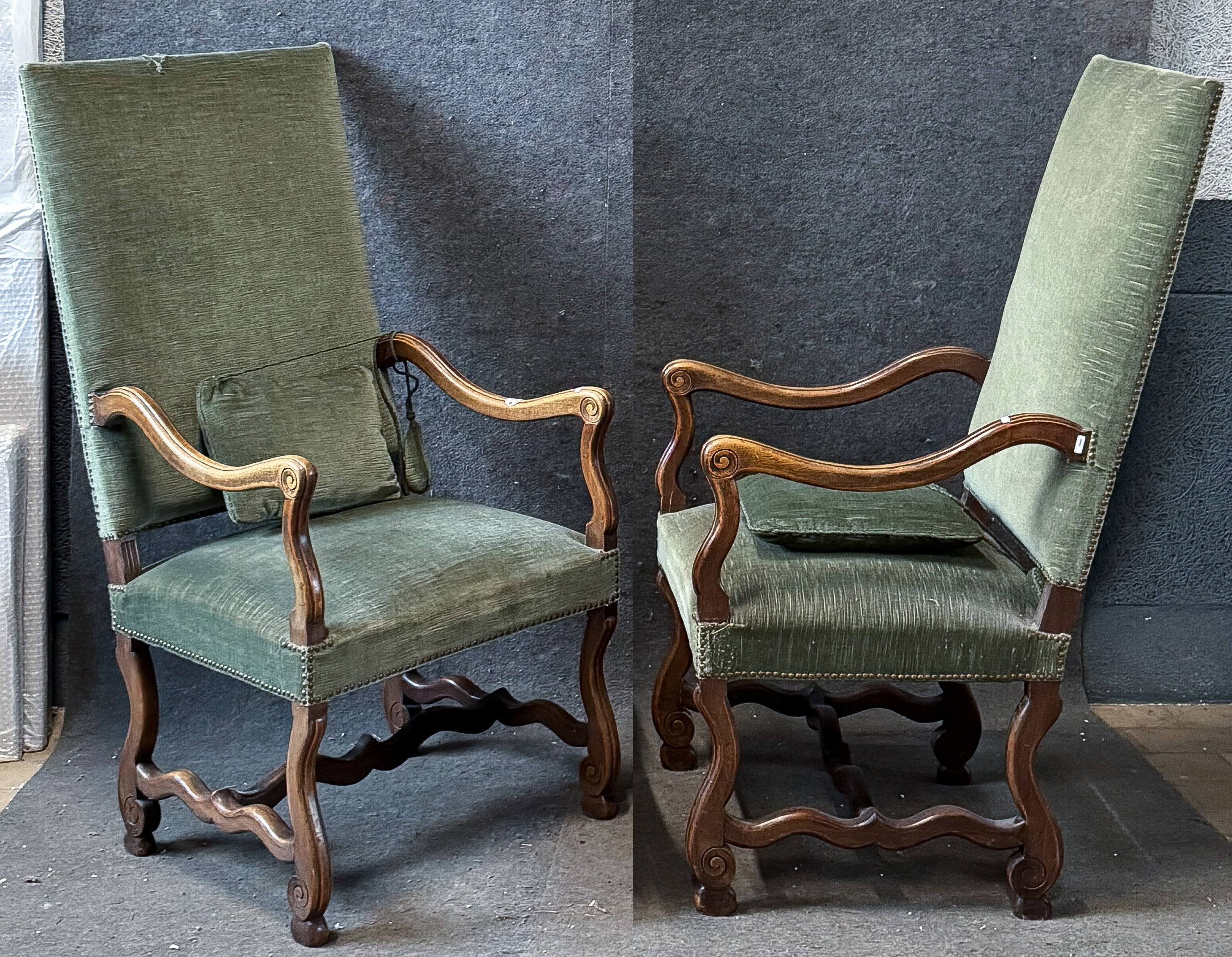 - Katalog-Nr: 692Ein Paar Historismus-Armlehnsessel. Deutsch um 1900. Massiv Nussbaum, geschweiftes Gestell, gepolsteter Sitz und Rücken. >>> Diese Los Nr. kann am Fr., den 10.04.26 (10.00 h bis 12.00 h) in unserem Depot in Mannheim abgeholt werden.o.L.
