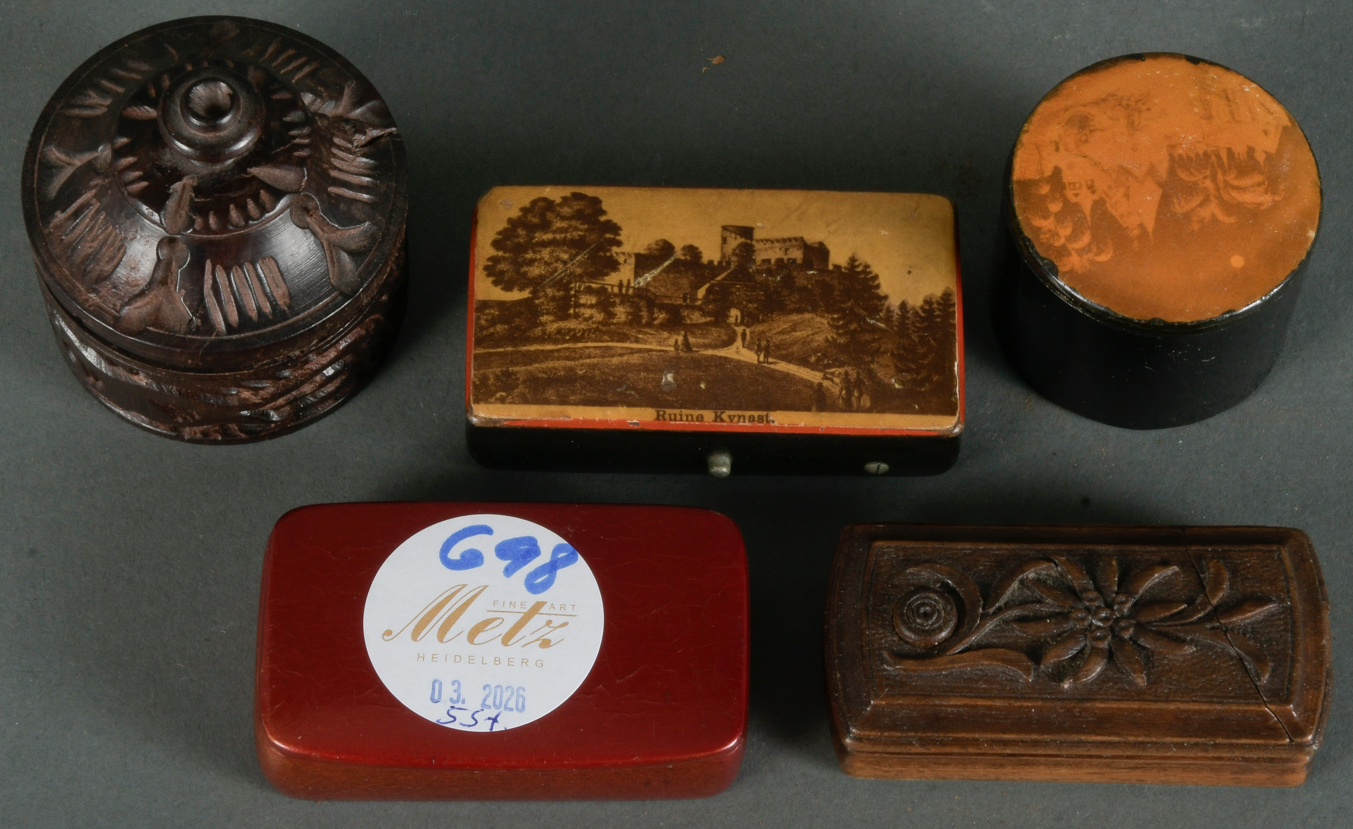 - Katalog-Nr: 698Fünf unterschiedliche Schnupftabakdosen. England / Russland um 1900. Holz / Pappmachée, 4,1 x 4,1 bis 5,1 x 6,2 cm.o.L.