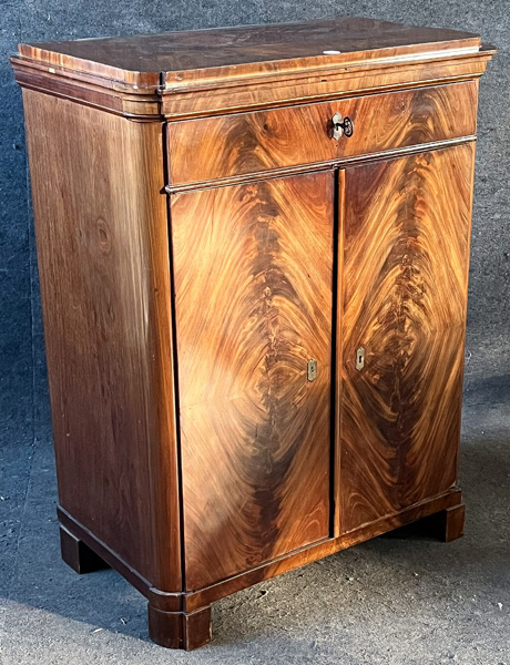 - Katalog-Nr: 683Spätbiedermeier-Kommode. Deutsch 19. Jh. Mahagoni, halbrunde bzw. Klotzfüße, gerade Sockelleiste, leicht überstehende, profilierte Deckplatte, zweitürig mit darüberliegendem Schub, H=106 cm, B=82 cm, T=47 cm. >>> Diese Los Nr. kann am Fr., den 10.04.26 (10.00 h bis 12.00 h) in unserem Depot in Mannheim abgeholt werden.o.L.