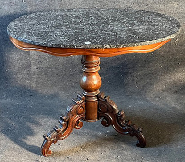 - Katalog-Nr: 685Ovaler Louis-Philippe-Beistelltisch. Frankreich 19. Jh. Massivholz, geschnitzt mit Voluten und Rocaillen; dreipassiger Fuß, gedrechselter Schaft, geschweifte Zarge, überstehende, ovale, grau-schwarze Marmorplatte, H=75 cm, B=97 cm, T=72 cm. >>> Diese Los Nr. kann am Fr., den 10.04.26 (10.00 h bis 12.00 h) in unserem Depot in Mannheim abgeholt werden.o.L.