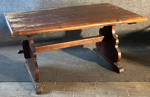 - Katalog-Nr: 690Wangentisch. Deutsch 20. Jh. Massiv Eiche, mit geschweiften Wangen, überstehender Platte und Steg, H=78 cm, B=160 cm, T=92 cm. >>> Diese Los Nr. kann am Fr., den 10.04.26 (10.00 h bis 12.00 h) in unserem Depot in Mannheim abgeholt werden.o.L.
