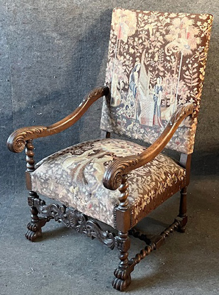 - Katalog-Nr: 693Historismus-Armlehnsessel. Deutsch um 1900. Massiv Eiche, geschnitzt, gedrechselt, geschweift mit zwei Krallenfüßen, Rückenlehne und Sitz mit Bilderteppich von märchenhaften Szenen. >>> Diese Los Nr. kann am Fr., den 10.04.26 (10.00 h bis 12.00 h) in unserem Depot in Mannheim abgeholt werden.o.L.