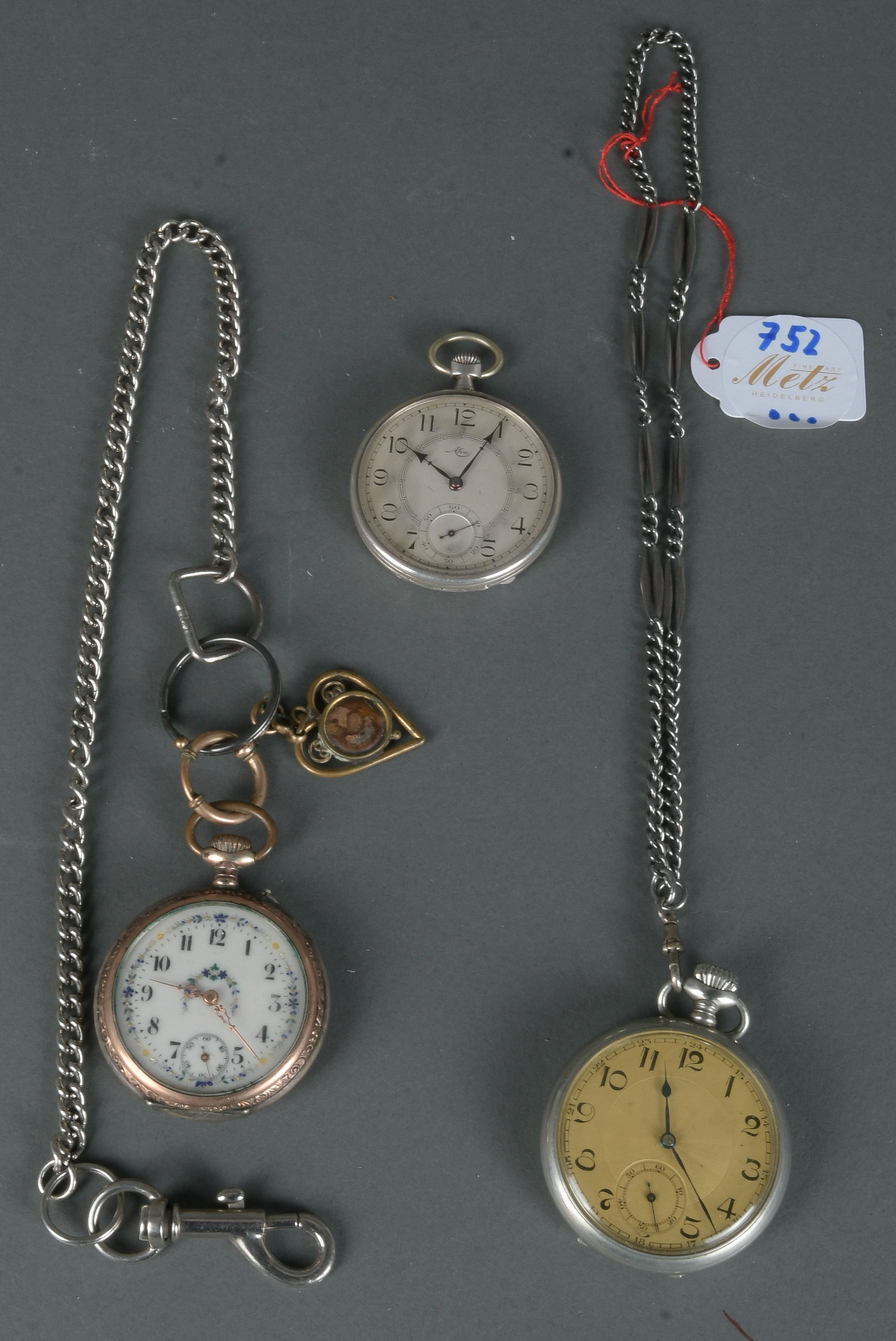 - Katalog-Nr: 752Drei Herrentaschenuhren. Silber, eine mit versilberter Uhrenkette. (Funktion ungeprüft)o.L.