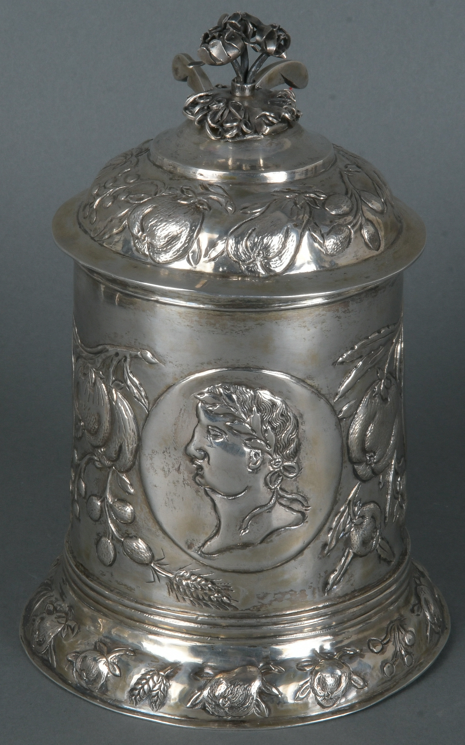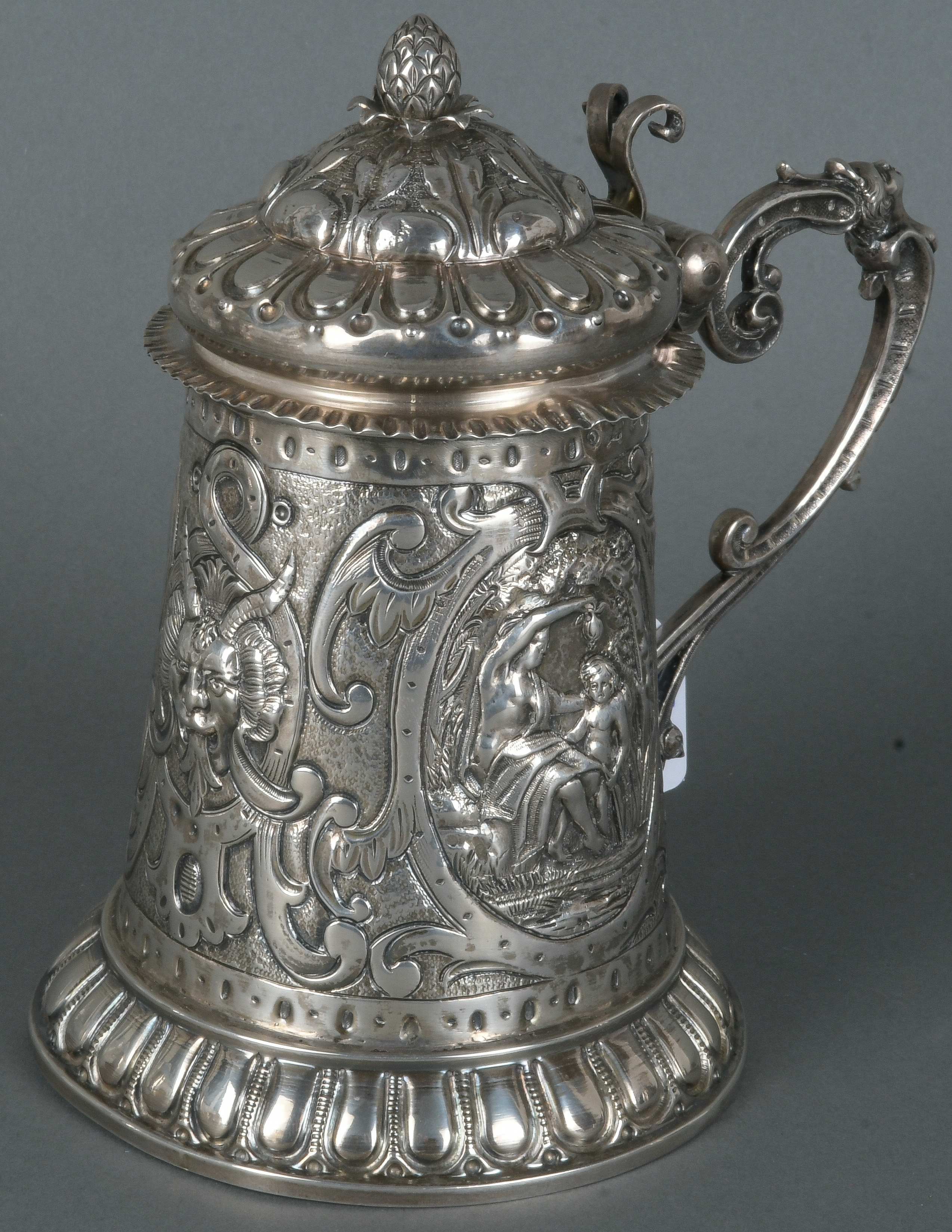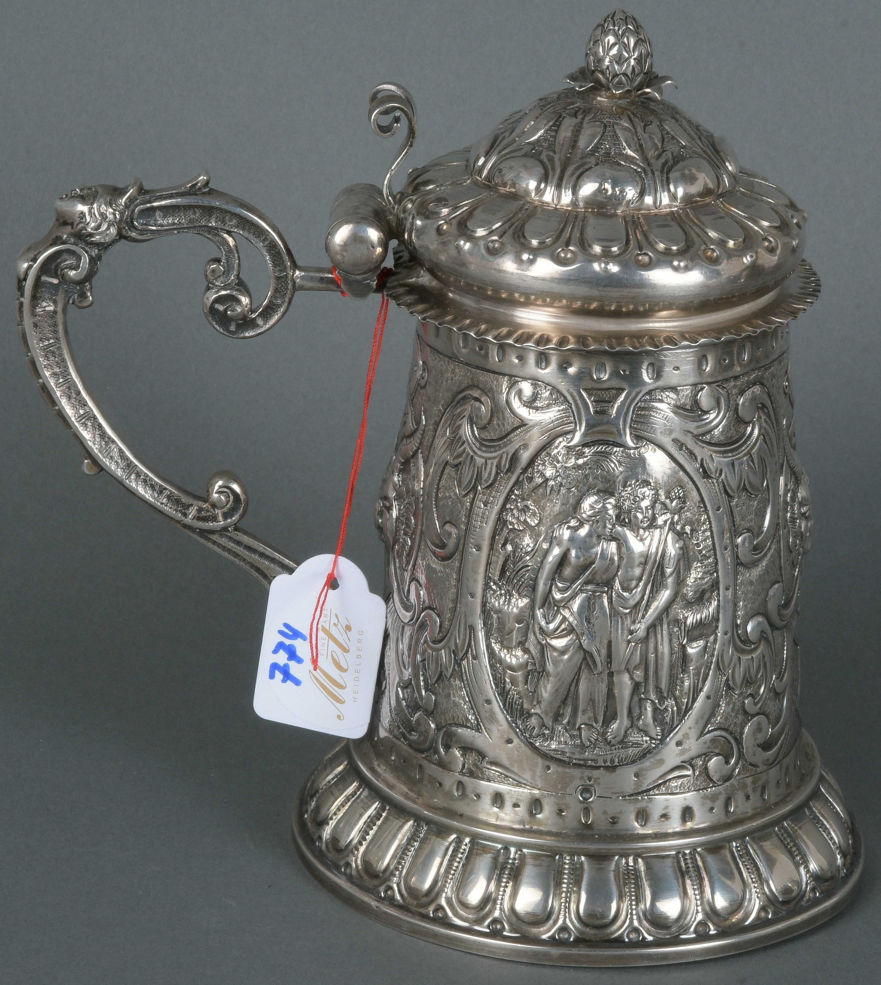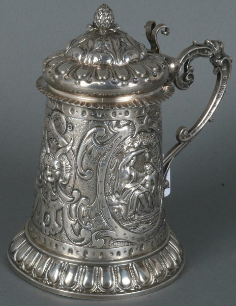 - Katalog-Nr: 754Deckelhumpen. Wohl Augsburg, Meister Anton Fischer. Silber, ca. 525 g, innen vermeilt, mit Stadt- und Meistermarke, H=17,8 cm.o.L.