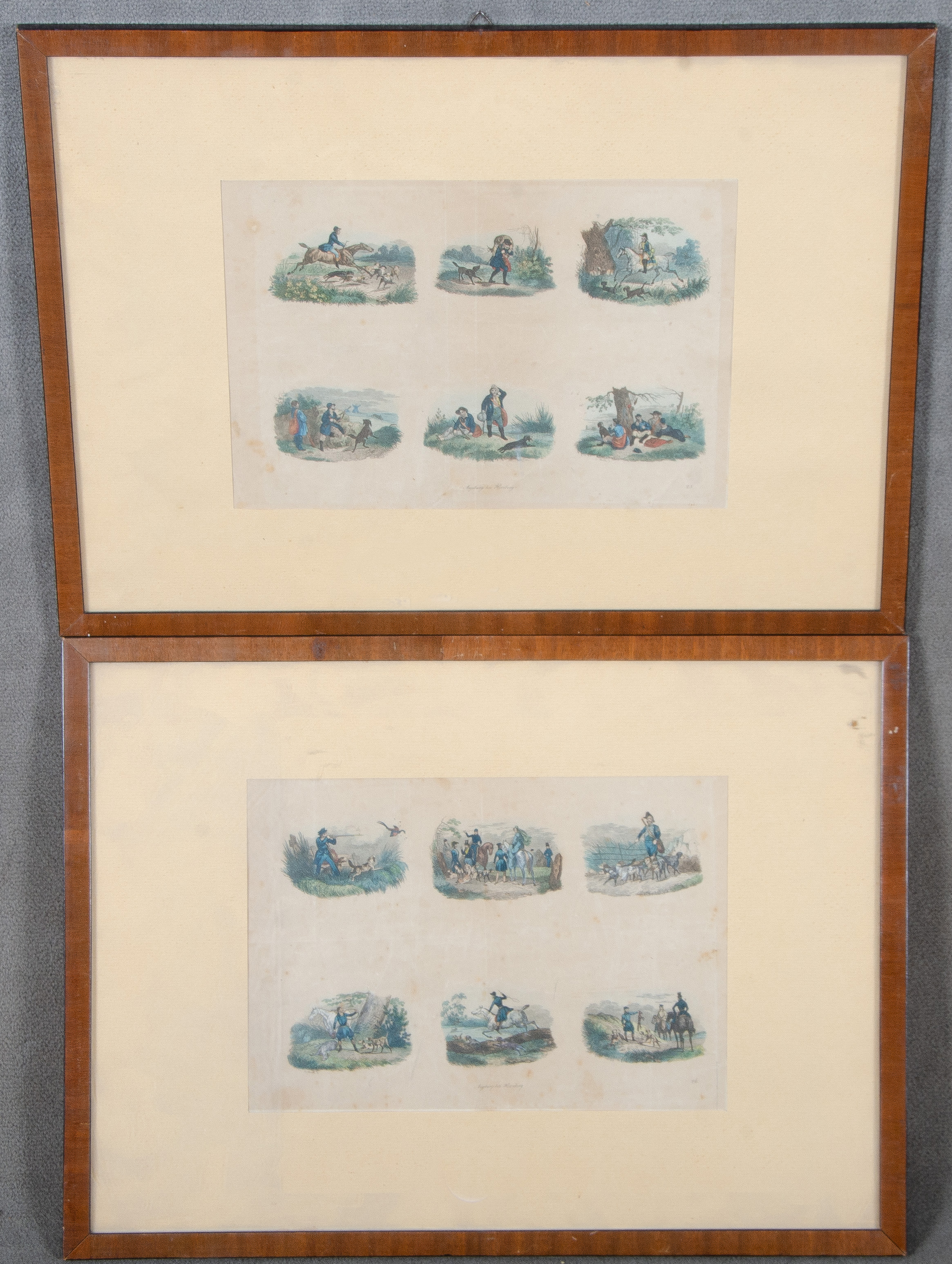 - Katalog-Nr: 758Graphiker des 19. Jhs. Konvolut Jagddarstellungen. Zwölf colorierte Kupferstiche, zwei Passepartout hi./Gl. gerahmt, je 19 x 27 cm.o.L.