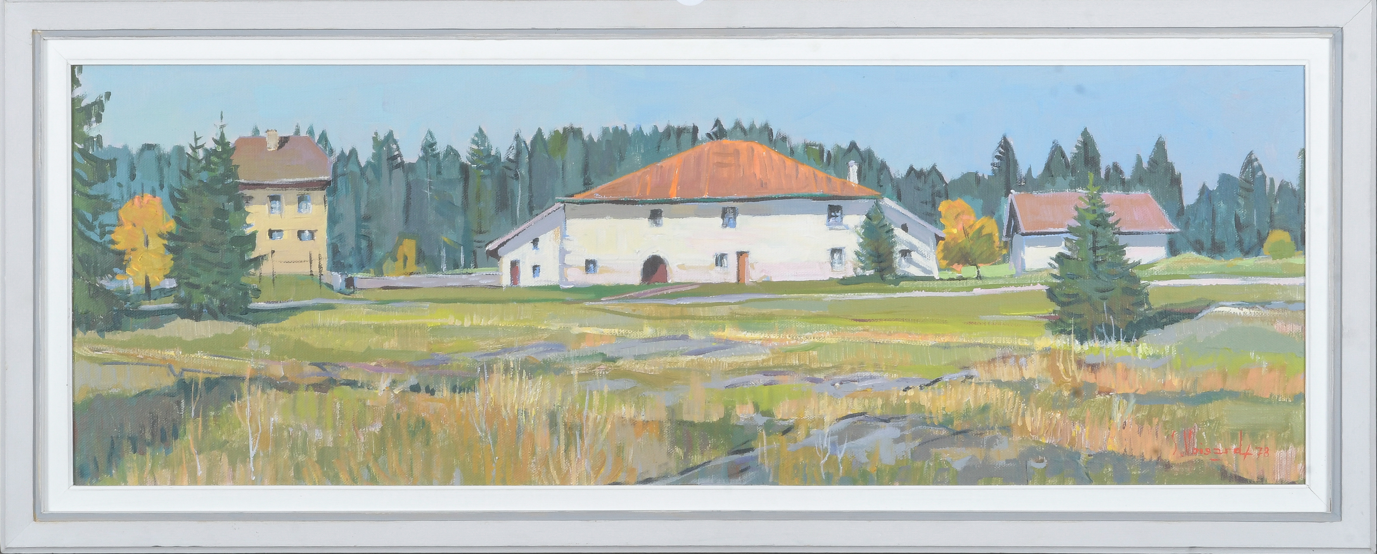 - Katalog-Nr: 762Serge Voisard (1913-1996). „vers l'automne (Cerneux-Veusil)“. Öl/Hartfaser, re./u./sign./dat. (19)78, verso bez., gerahmt (35,5 x 102 cm). Provenienz: Dobiaschofsky Auktion, Bern 2011.o.L.