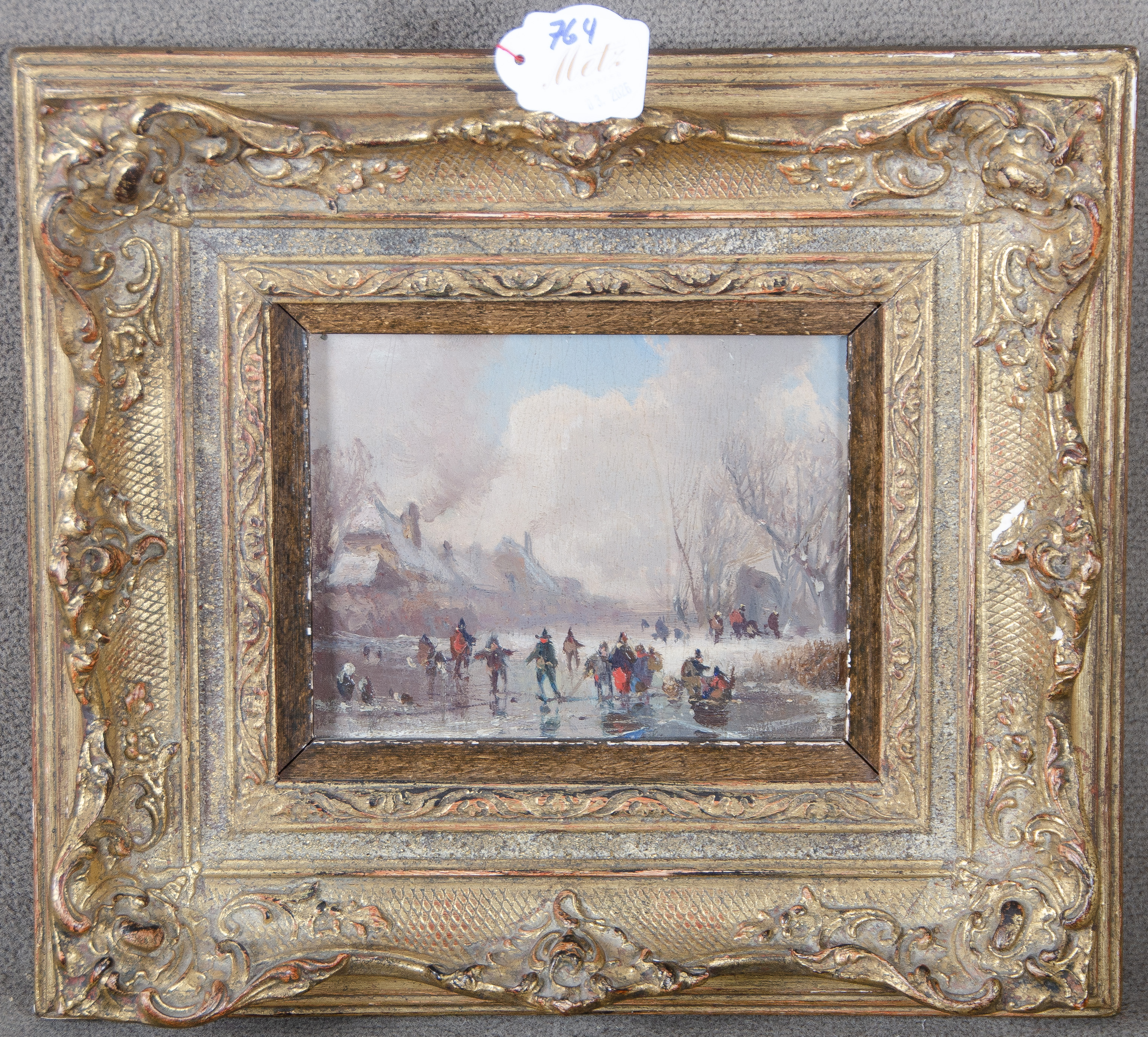 - Katalog-Nr: 764Adolf Stademann (1824-1895) attrib. Winterlandschaft mit Schlittschuhläufern. Öl/Holz, gerahmt, 12 x 15 cm.o.L.