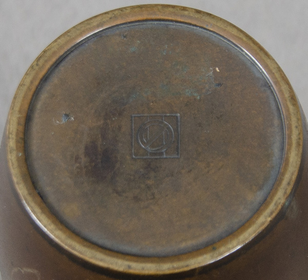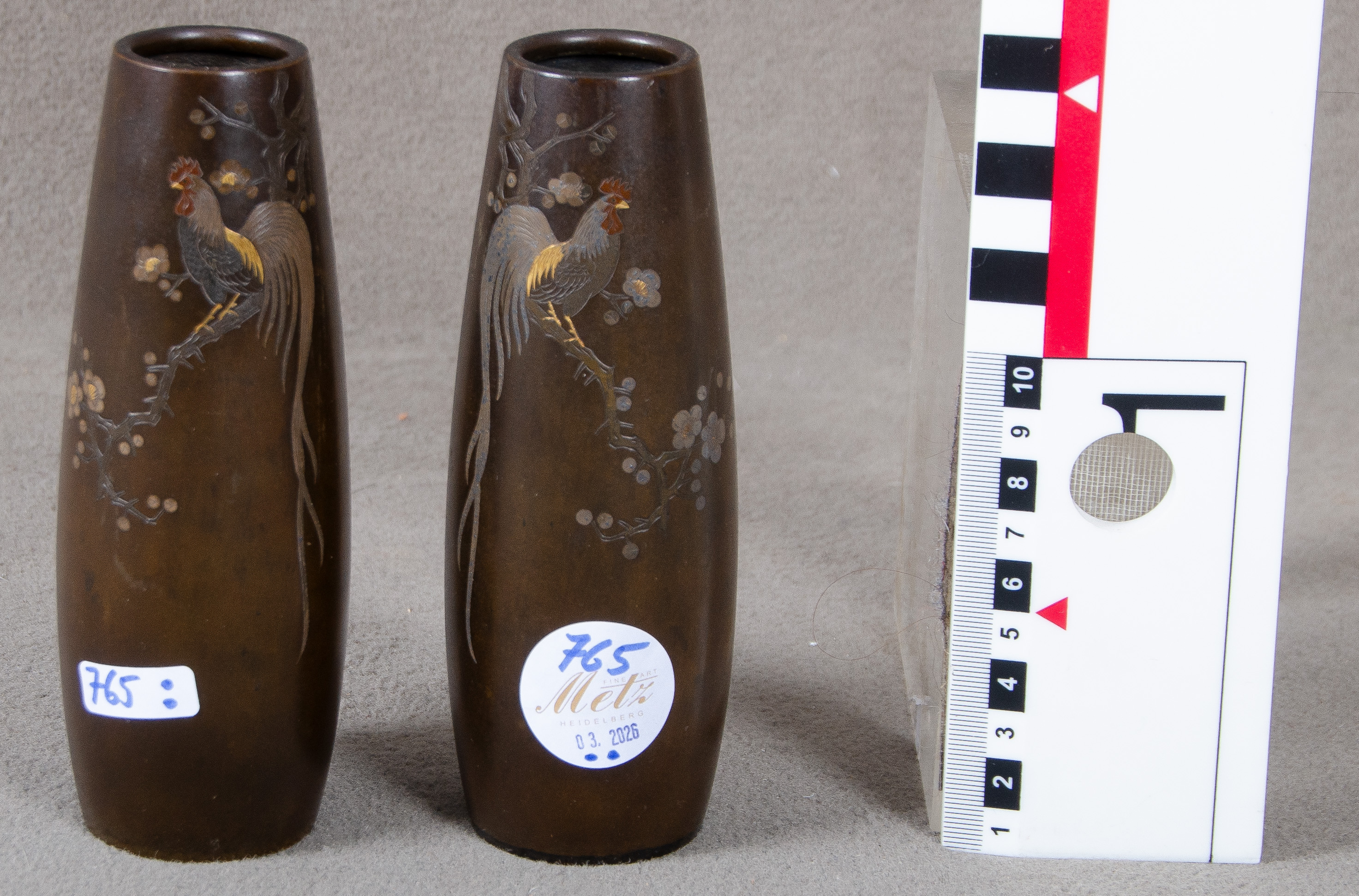 - Katalog-Nr: 765Paar Vasen. Japan, Meiji-Epoche 1868-1912. Bronze, mit Goldeinlagen in Form von Paradiesvögeln auf blühenden Zweigen; am Boden Manufakturmarke von Noboru Nogawa (1851-1910), H=15,4 / 15,5 cm.o.L.