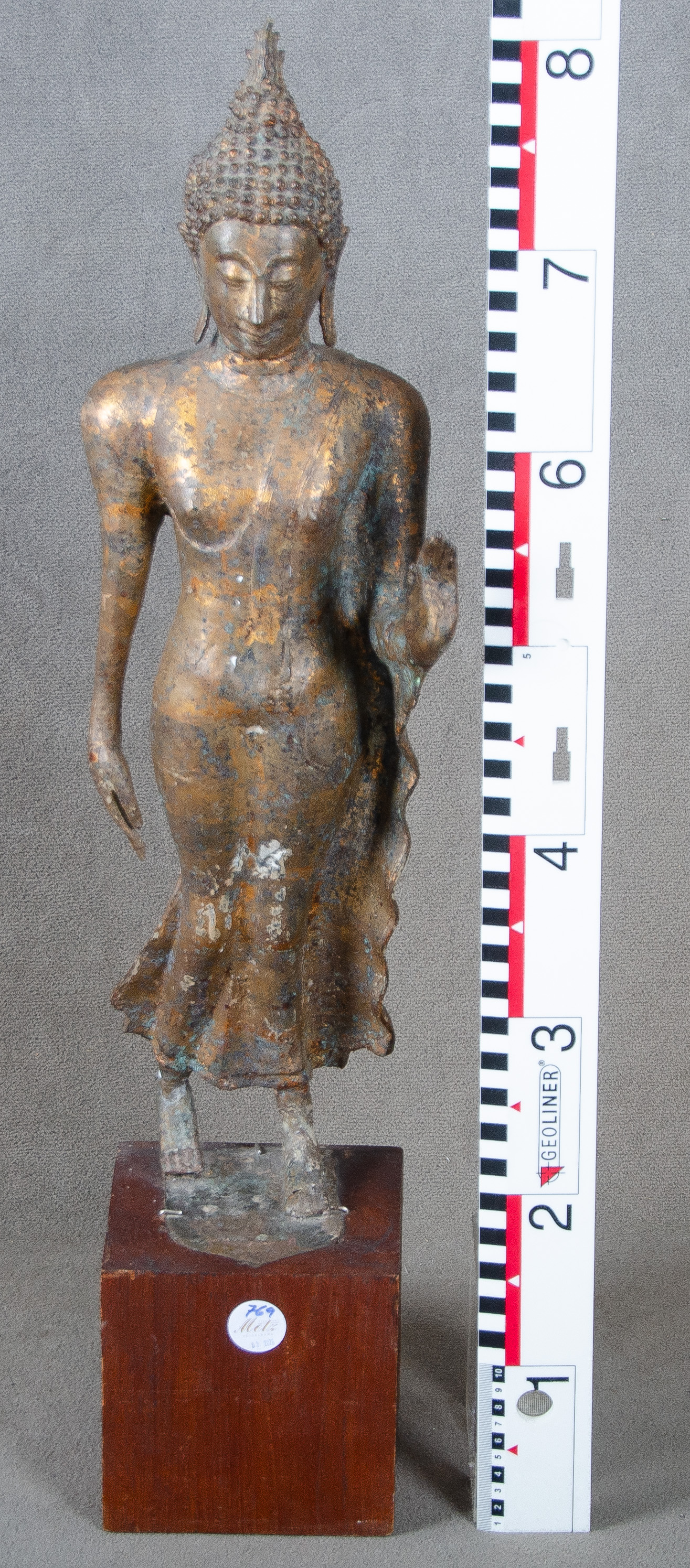 - Katalog-Nr: 769Abhaya Mudra. Thailand 19. Jh. / frühes 20. Jh. Metall, mit Resten alter Vergoldung, H=63 cm / mit Holzsockel: 79 cm.o.L.