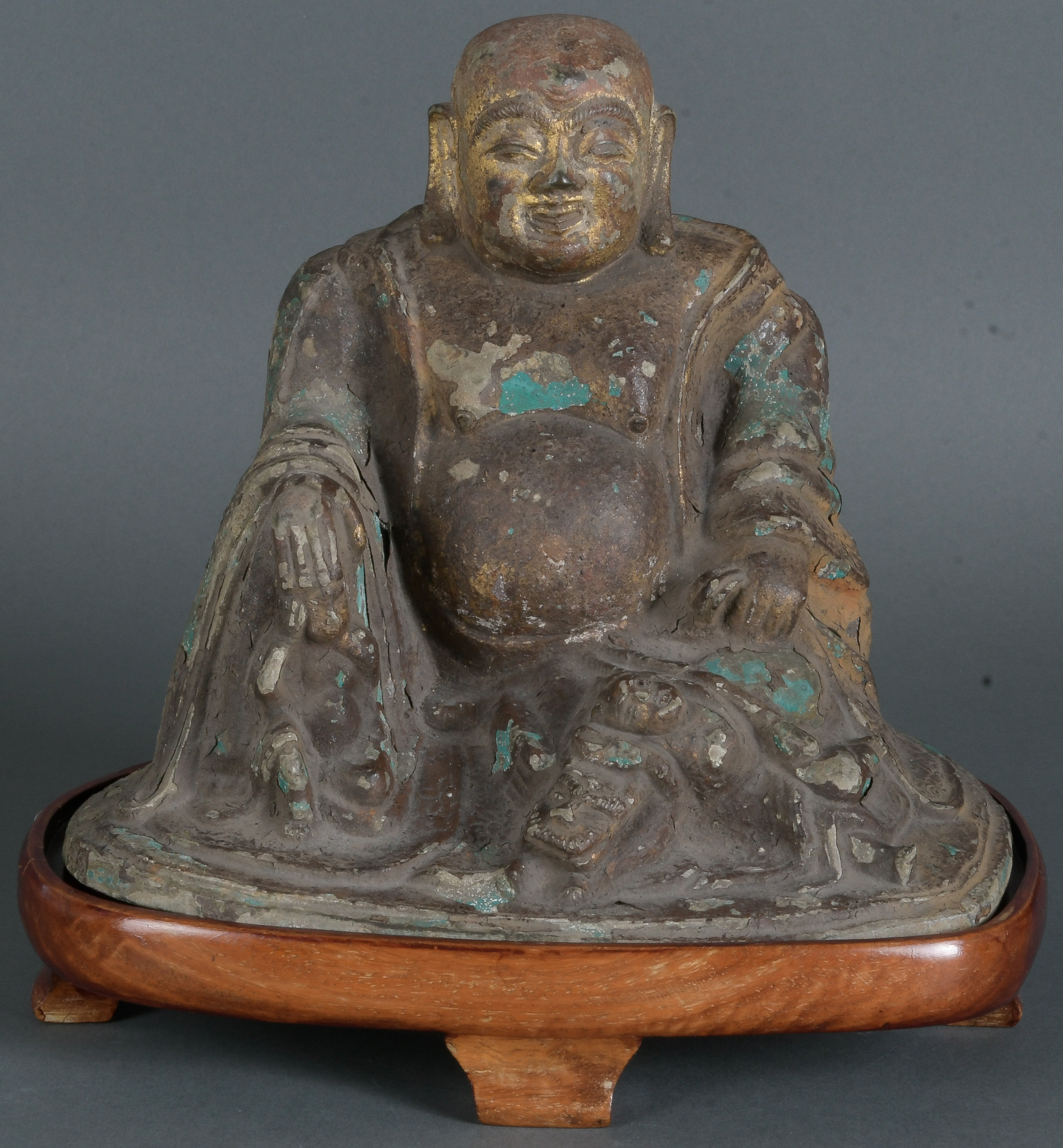 - Katalog-Nr: 771Budai Qieci (chinesischer Mönch). Ming-Epoche wohl 16. Jh. Metall, mit Resten alter Bemalung und Vergoldung, H=17,2 cm / mit Holzsockel: 21 cm.o.L.