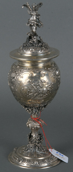 - Katalog-Nr: 751Deckelpokal. Hanau um 1900. Silber (geprüft), ca. 476 g, ungepunzt, H=27,4 cm. (min. besch.)o.L.