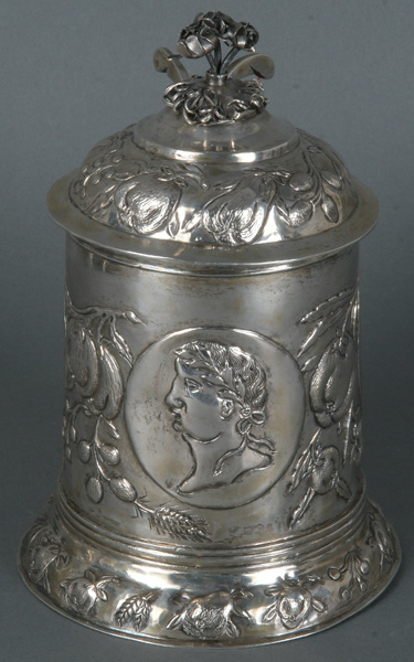 - Katalog-Nr: 774Prunkhumpen. Schweden 19. Jh. Silber, ca. 443 g, aufwendig reliefiert und ziseliert, am Boden gepunzt, H=18 cm, D=12,4 cm.o.L.