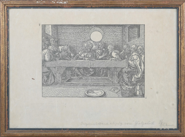 - Katalog-Nr: 755Albrecht Dürer (1471-1528). Abendmahl. Holzschnitt, re./u./monogr./dat. 1523, hi./Gl. gerahmt, 21 x 29 cm. (späterer Abzug)o.L.
