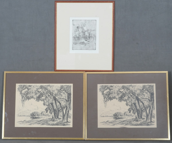 - Katalog-Nr: 756Adolf Brunner (1905-1975). Christliche Szene. Holzschnitt 4/16, re./u./sign.; dazu Graphiker des 20. Jhs. Zwei Landschaften mit Personenstaffage. Lithographien, unleserlich sign., je mit Passepartout hi./Gl. gerahmt, 24,5 x 19,5 / 35,5 x 46,5 cm.o.L.