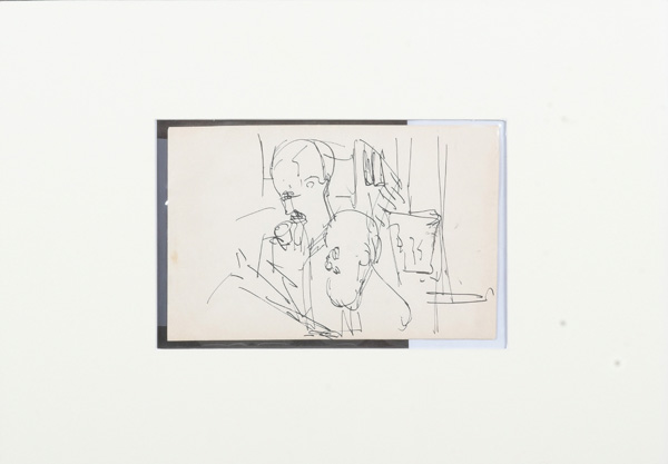 - Katalog-Nr: 763Albert Müller (1897-1926) attrib. Zwei Männer, verso eine stehende Person. Tuschfederzeichnung, verso Zeichnung, mit Passepartout, ungerahmt, 16 x 24,5 cm.o.L.