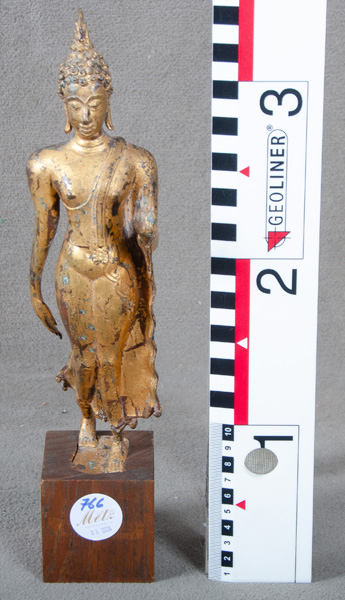 - Katalog-Nr: 766Abhaya Mudra. Thailand frühes 20. Jh. Metall, mit Resten alter Vergoldung, H=26,5 cm / mit Holzsockel: 33,5 cm.o.L.
