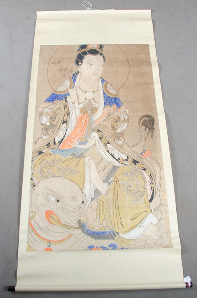 - Katalog-Nr: 772Rollbild. Asien. Papier, bunt bemalt mit dem Porträt einer Hofdame mit Fabeltier, 148 x 80 cm. (min. besch.)o.L.