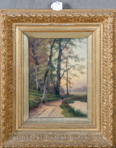 - Katalog-Nr: 773Eduard Hein II. (1854-1918). Landschaft mit Weg an Waldrand und See. Öl/Lw., li./u./sign./bez. „Düsseldorf“, gerahmt, 29 x 22 cm.o.L.