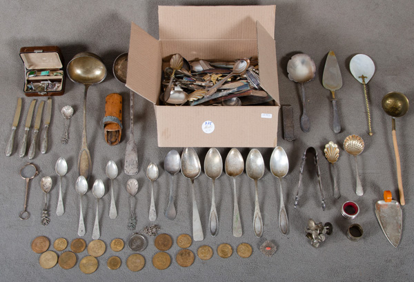 - Katalog-Nr: 775Konvolut Speisebesteck und Münzen. Silber, ca. 800 g / versilbert, u.a. Löffel, Messer, Serviettenring und Vorlegebesteckteile.o.L.