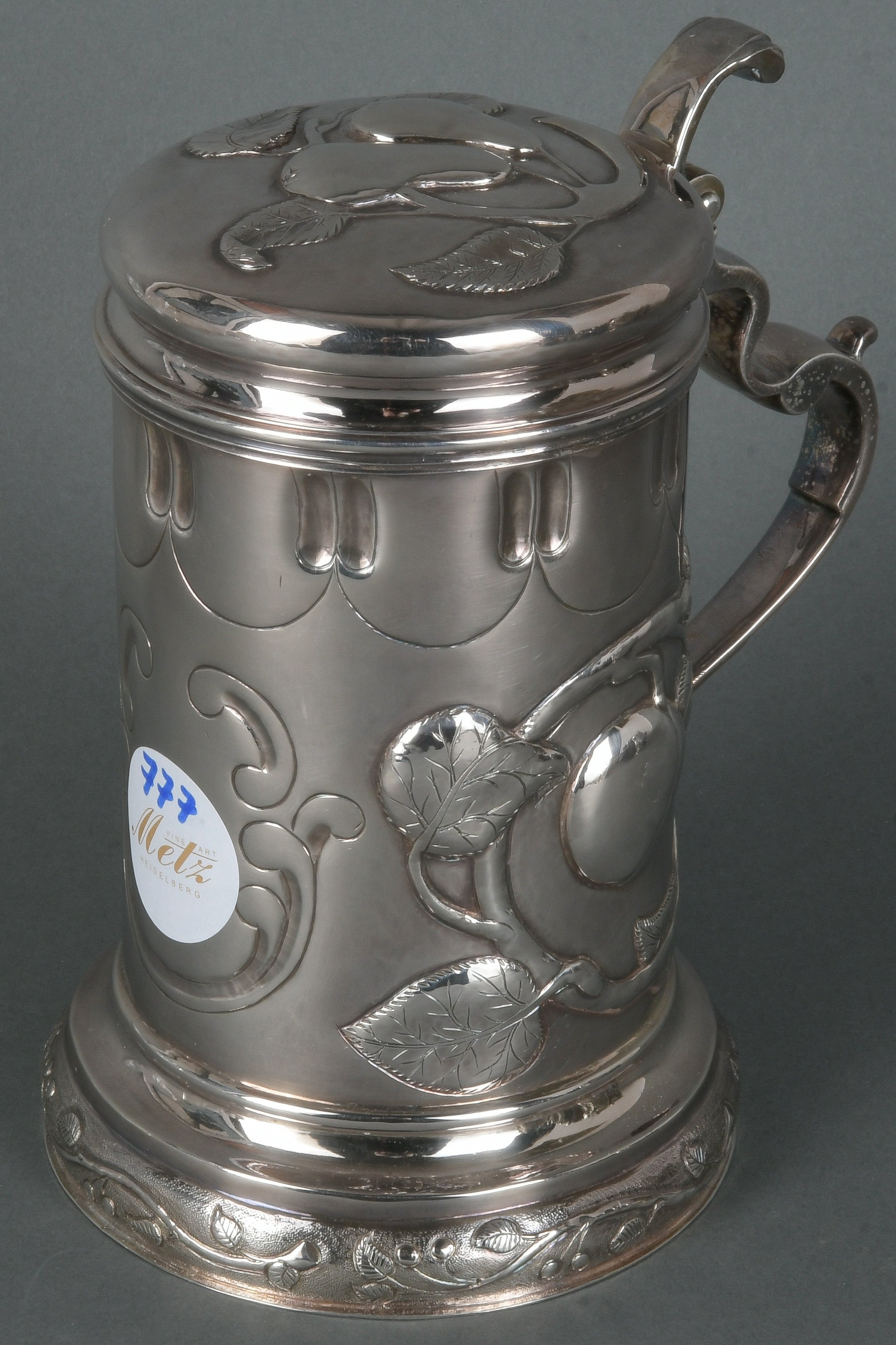 - Katalog-Nr: 777Deckelhumpen. Deutsch 20. Jh. 925er Sterlingsilber, ca. 566 g, floral reliefiert, am Boden gepunzt, H=17,5 cm.o.L.