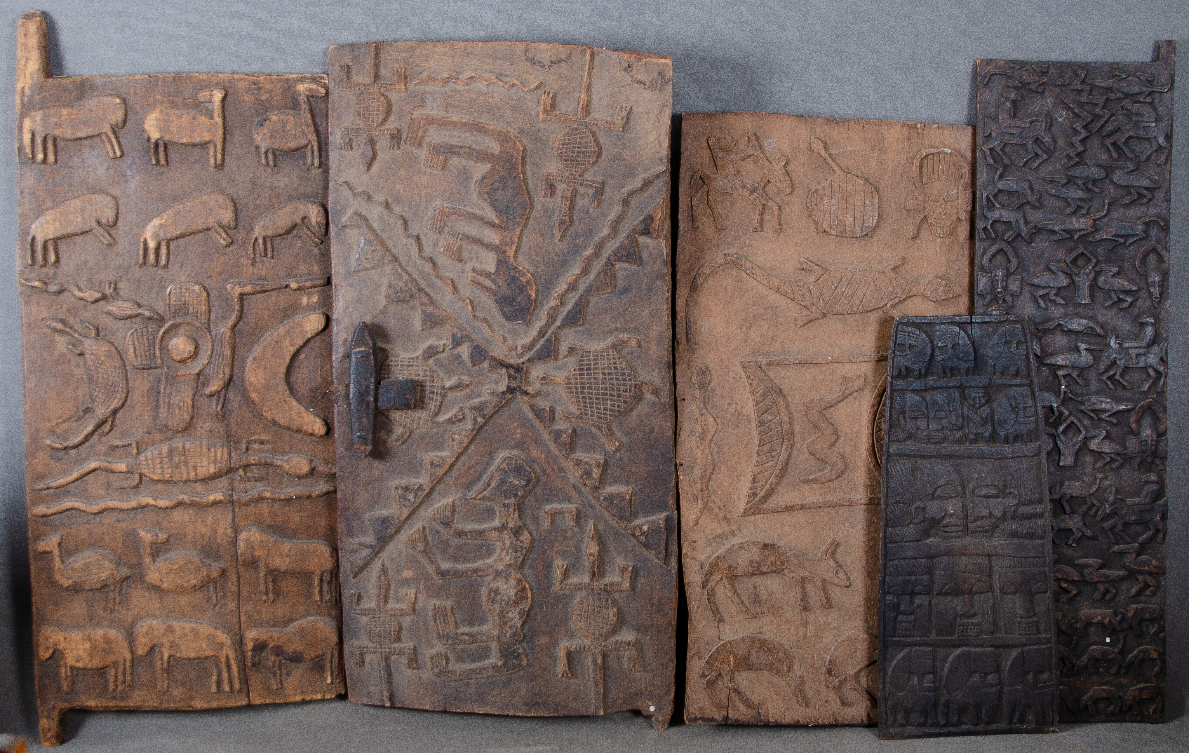 - Katalog-Nr: 779Fünftlgs. Konvolut Afrikana: Türen bzw. Wandpaneele. Massivholz, geschnitzt mit Tieren, Masken und Figuren, teilw. mit Jagdszenen, 86 x 35 bis 148 x 63 cm.o.L.