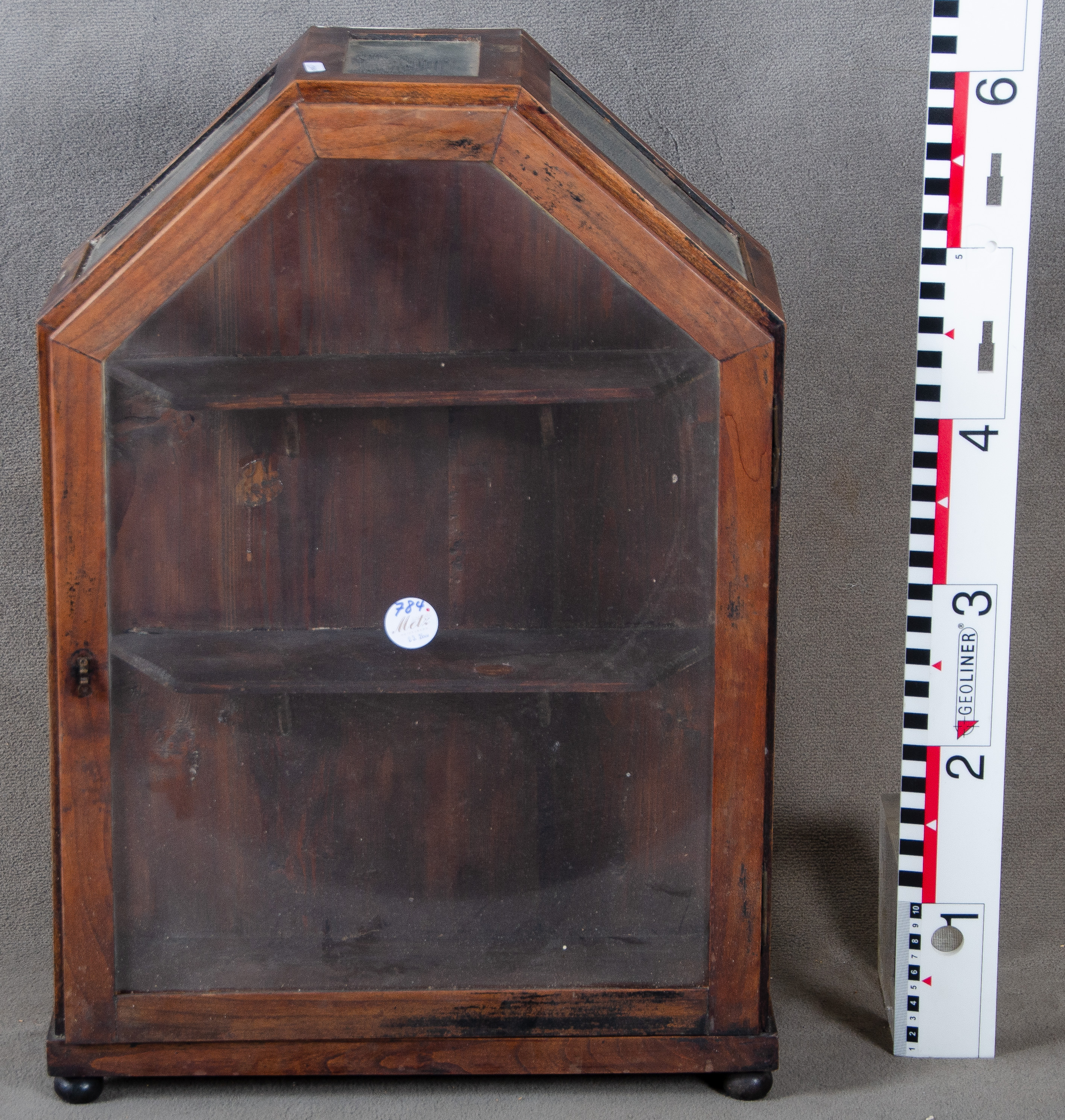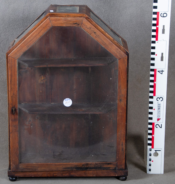 - Katalog-Nr: 784Kleine Hängevitrine. Deutsch 20. Jh. Massiv Nussbaum; trapezförmig, auf Kugelfüßen, eintürig, Front, Seiten und Fachböden verglast, H=61 cm, B=42 cm, T=18 cm.o.L.