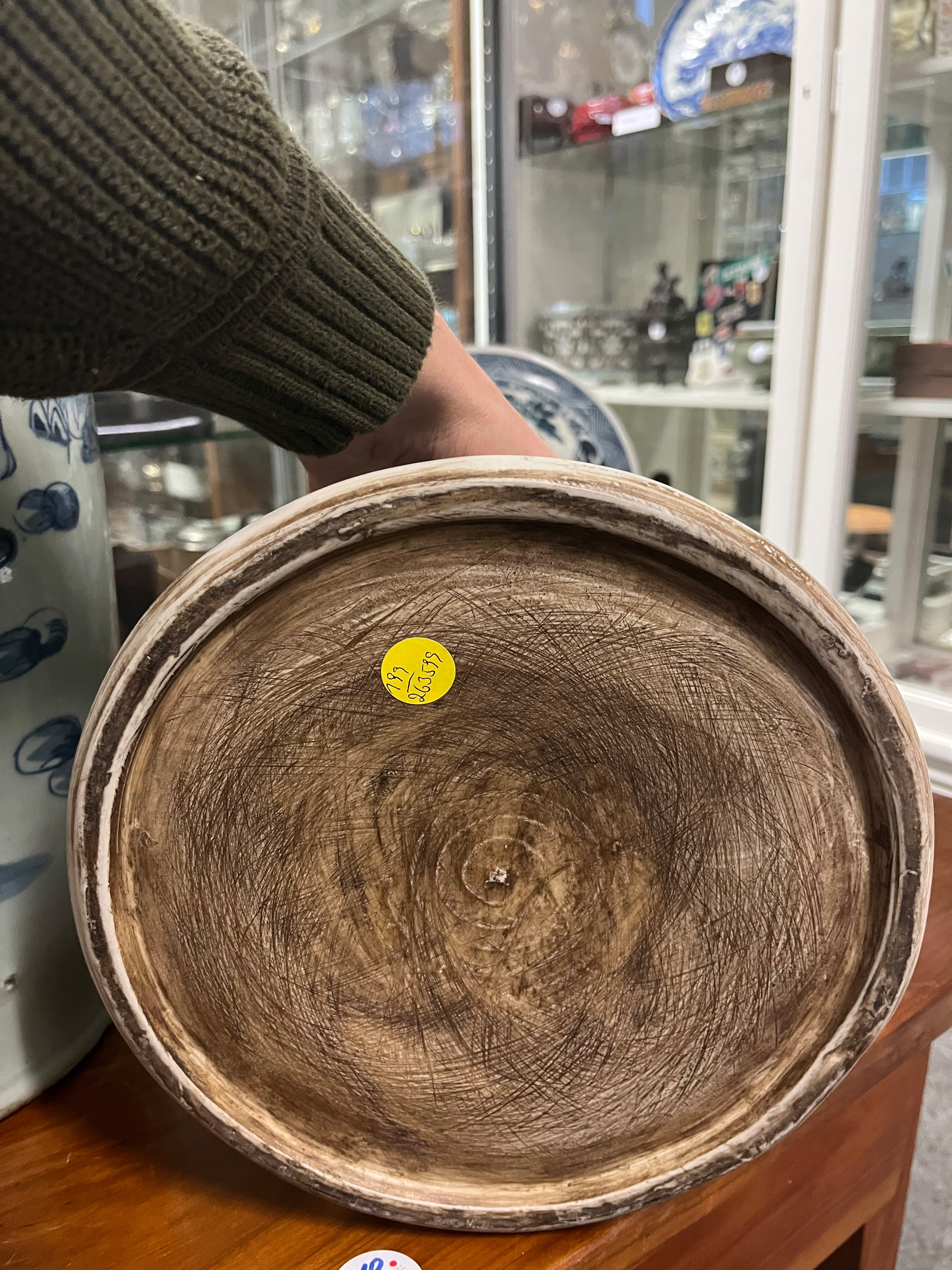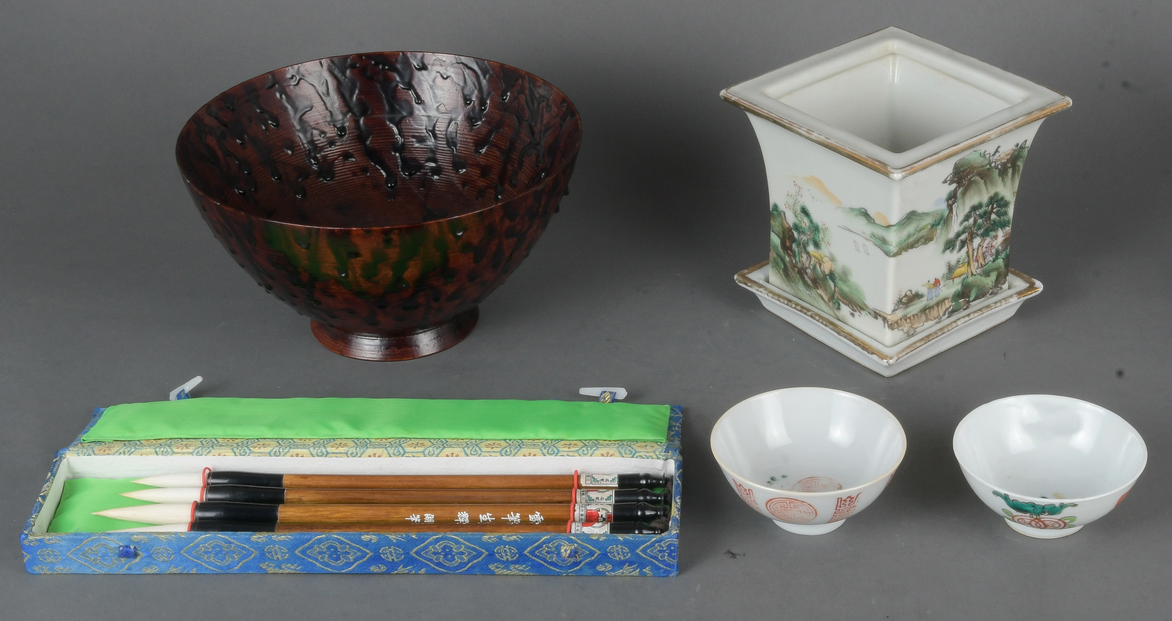 - Katalog-Nr: 786Fünftlgs. Konvolut Asiatika aus Holz und Porzellan: Vier Schabstifte im Etui, eine runde Kumme (H=11,5 cm, D=21 cm), ein Cachepot (H=14 cm) und zwei Koppchen.o.L.