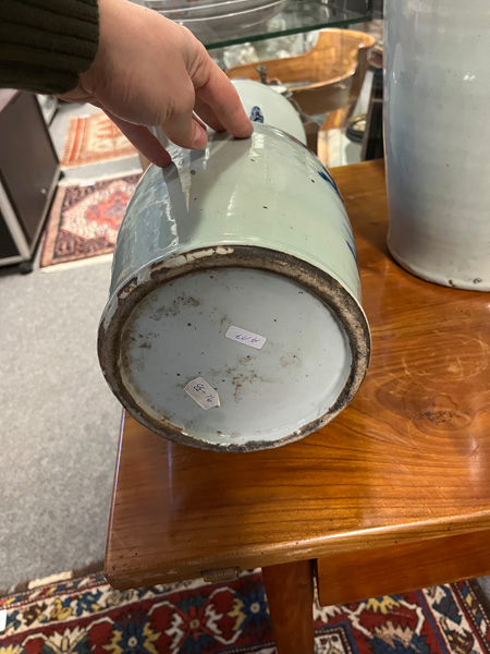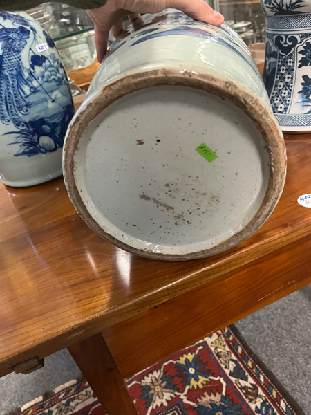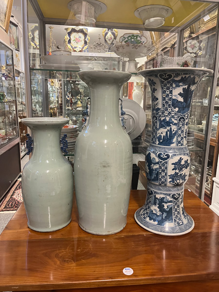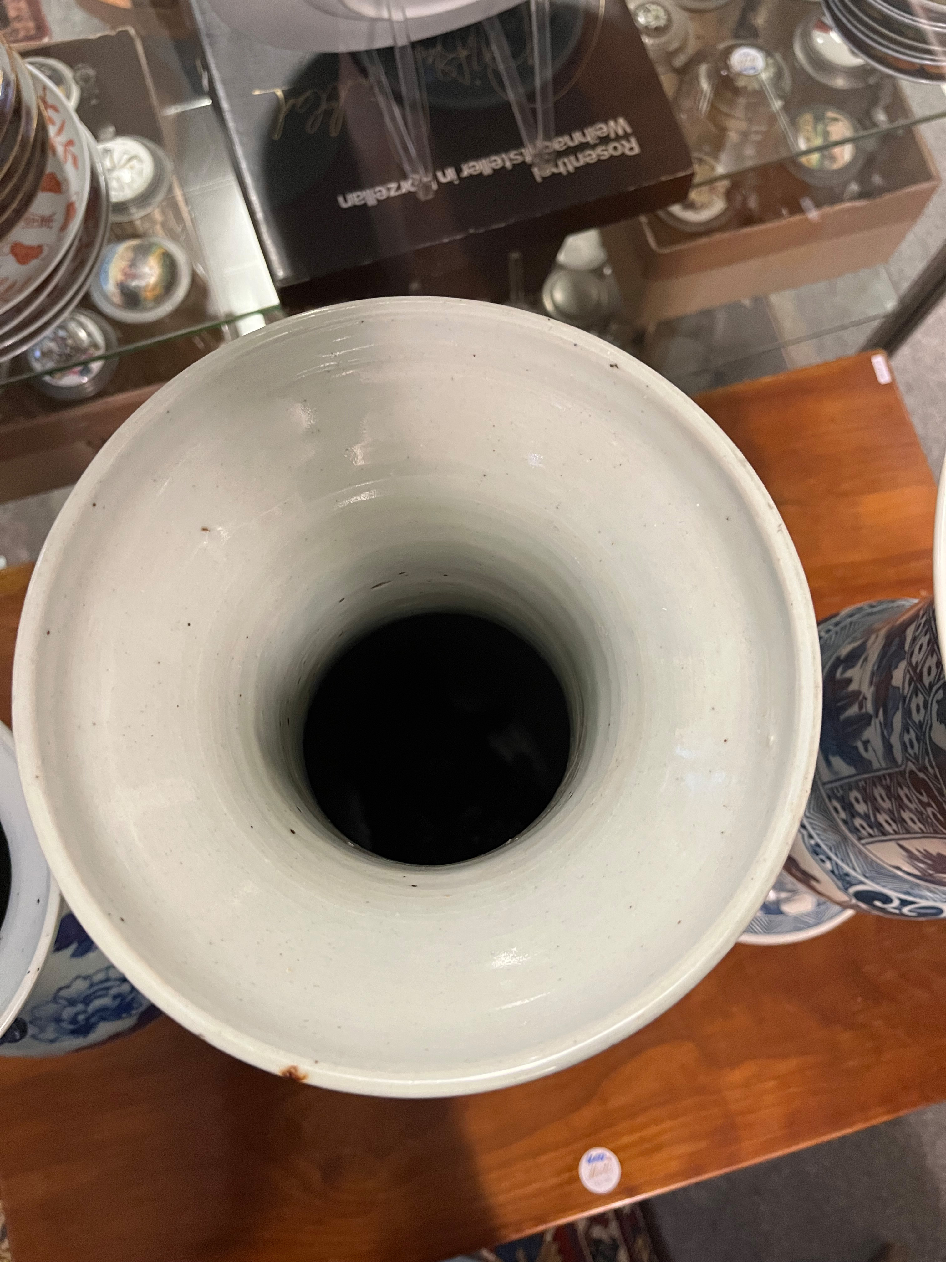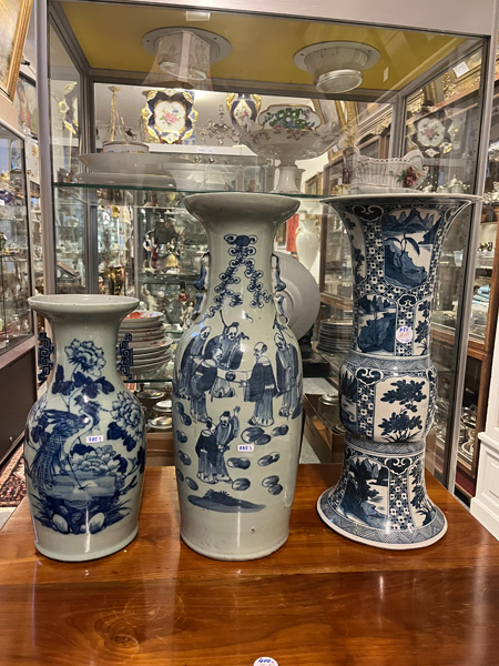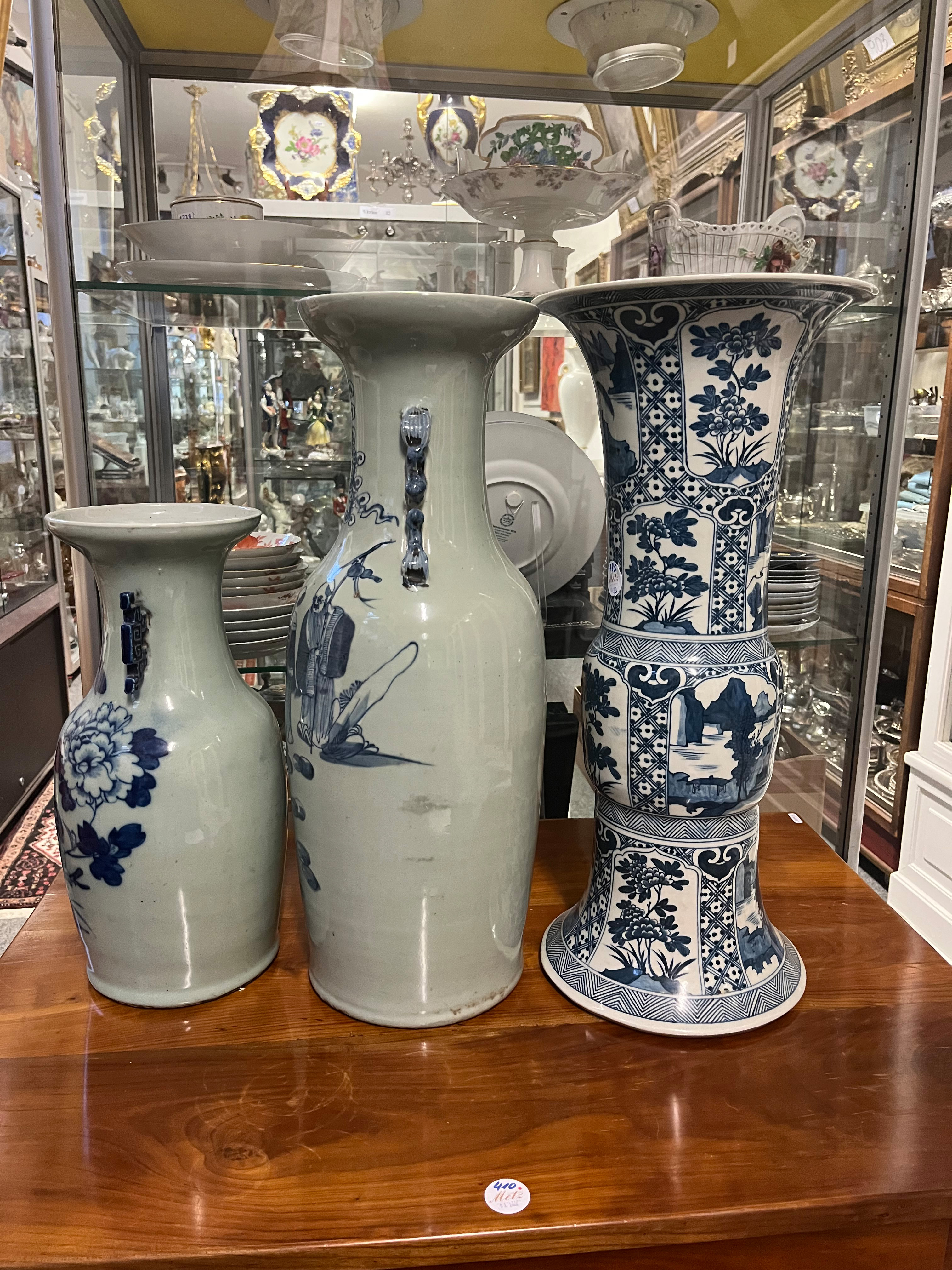 - Katalog-Nr: 785Drei Vasen. Asien. Porzellan, unterglasurblau bemalt mit Figuren in Landschaft und Ornamentik, H=43 bis 60 cm.o.L.