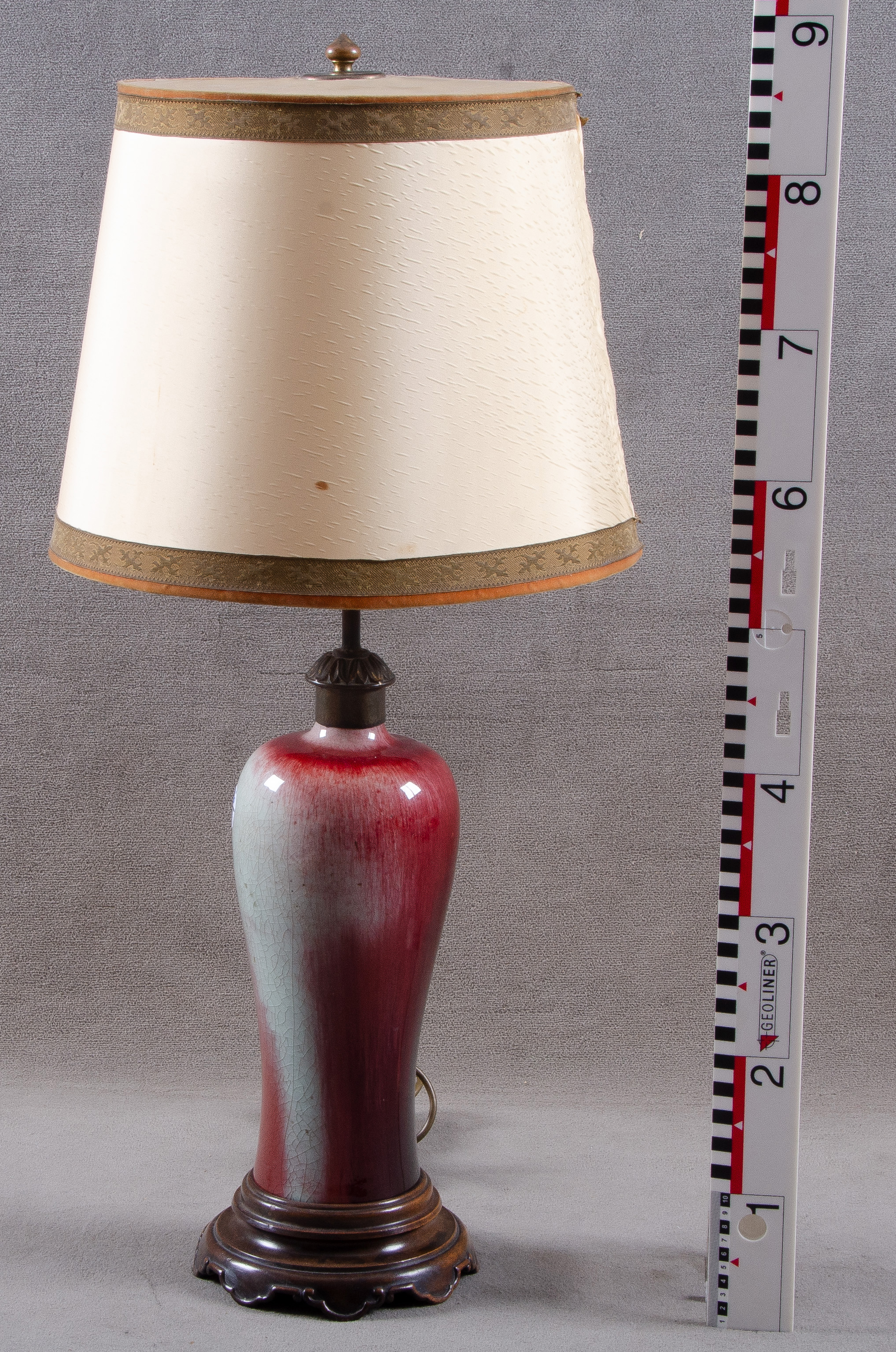- Katalog-Nr: 788Kegelförmige Vase. Asien. Porzellan, mit Ochsenblutglasur; runder, geschnitzter Massivholzfuß und Stoffschirm, H=90 cm. (später umfunktioniert zur Tischlampe / Funktion ungeprüft)o.L.