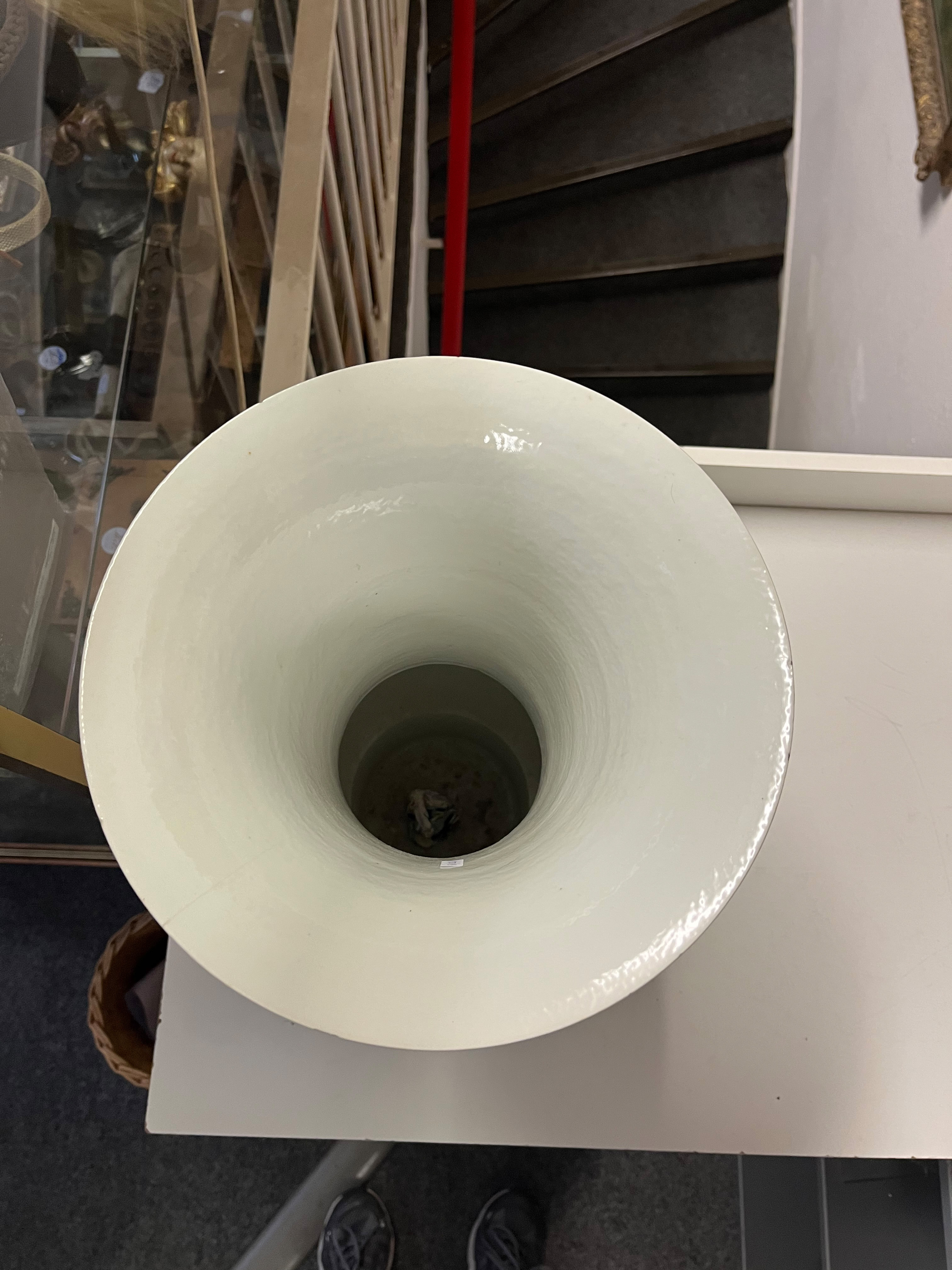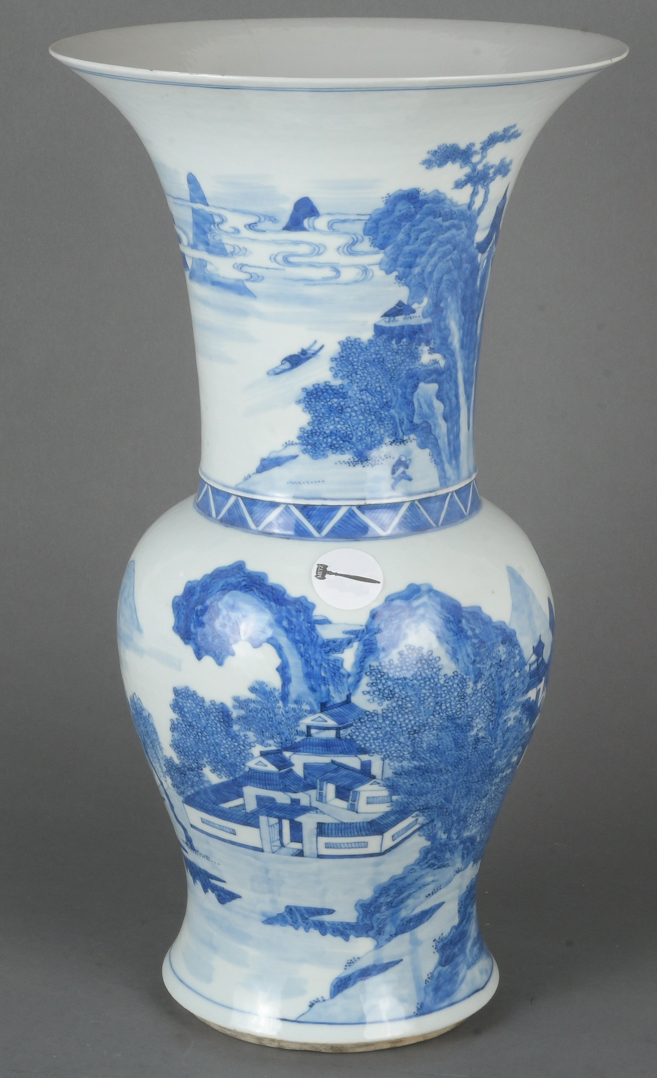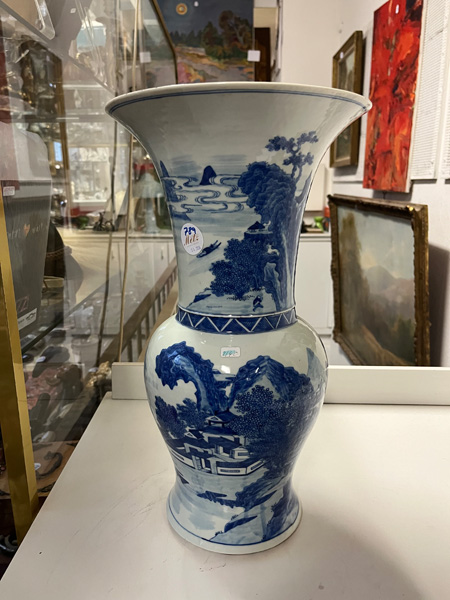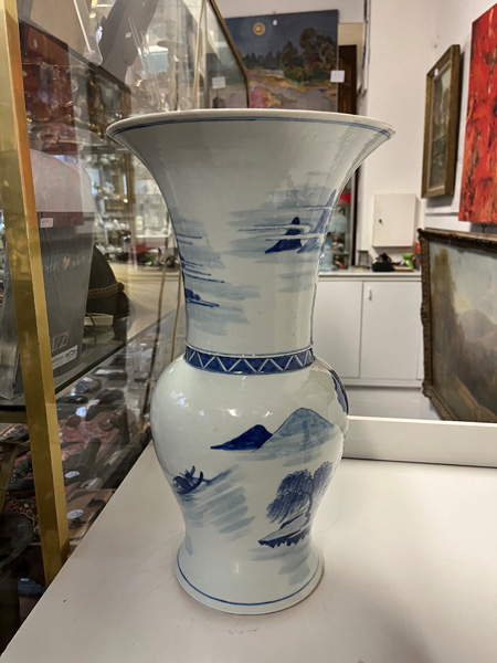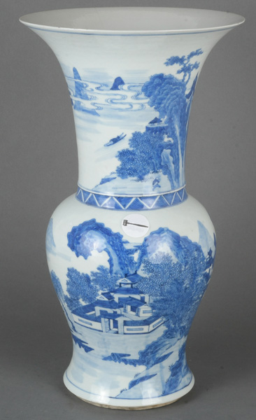 - Katalog-Nr: 789Hohe Vase. Asien. Porzellan, unterglasurblau bemalt mit Architekturlandschaft; am Boden gemarkt, H=45 cm.o.L.