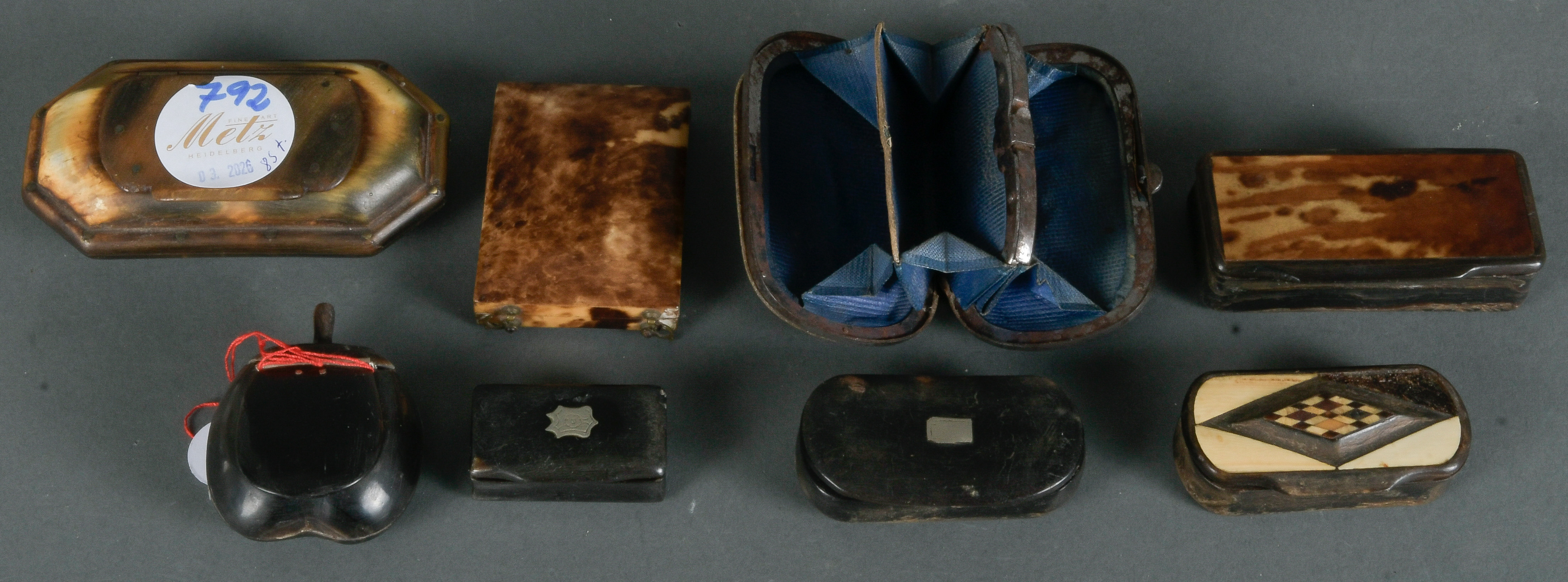 - Katalog-Nr: 792Acht unterschiedliche Schnupftabakdosen und Etuis. England 19. Jh. und später. Meist Horn bzw. Schildpatt, H=1,6 cm, B=4,1 cm, T=2,4 cm bis H=3 cm, B=9,3 cm, T=4,9 cm.o.L.