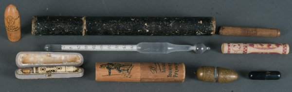 - Katalog-Nr: 787Acht unterschiedliche Etuis. Deutschland / England 19. Jh. und später. Holz / Messing / Pappmachée, teilw. mit Inhalt u.a. Thermometer, Nadeln und Salben, L=4 bis 23 cm.o.L.