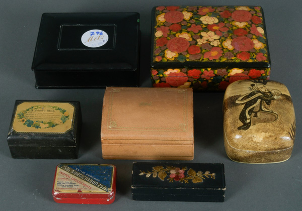 - Katalog-Nr: 796Sieben unterschiedliche kleine Boxen. England um 1900 und später. Bakelit / Blech / Leder / Pappmachée, H=1,8 cm, B=6 cm, T=4 cm bis H=4,5 cm, B=12,8 cm, T=10,2 cm.o.L.