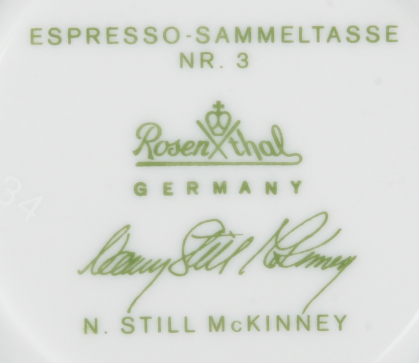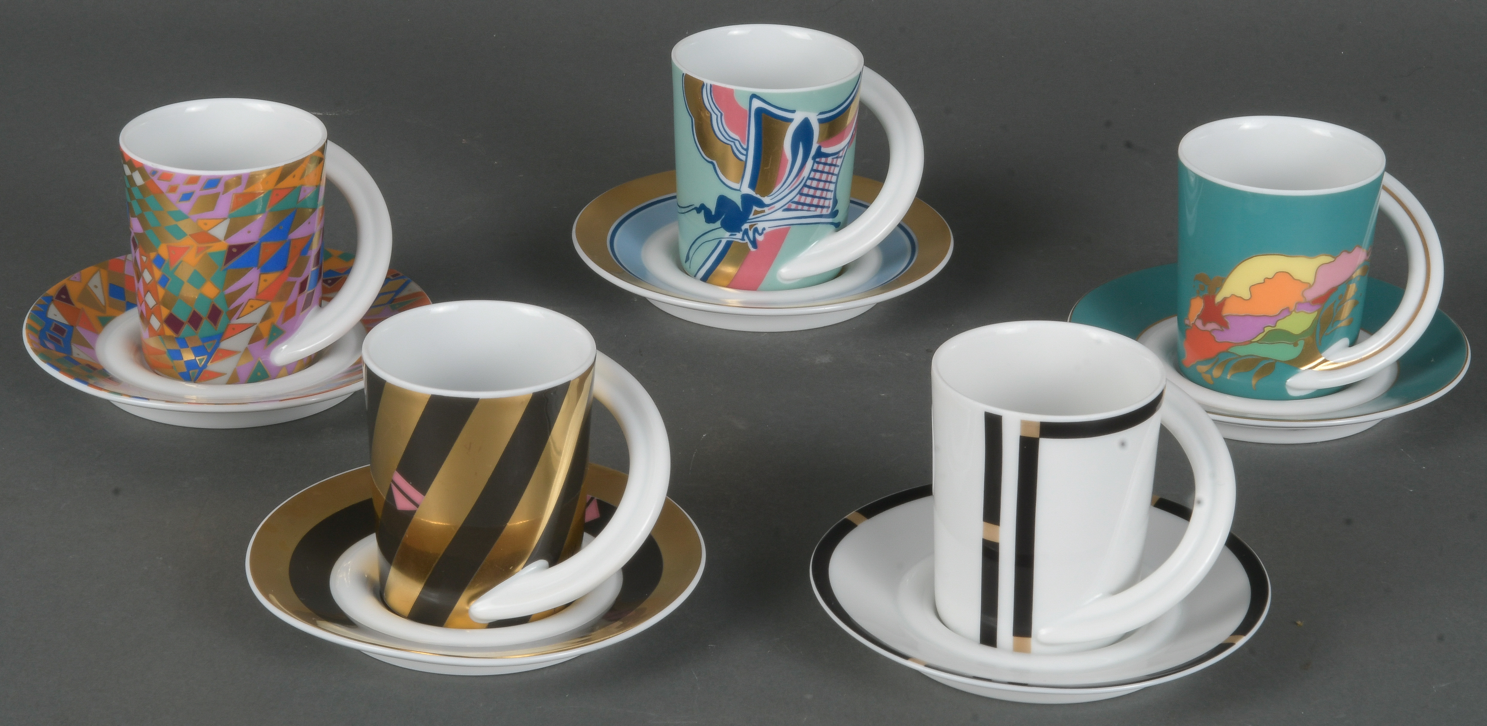 - Katalog-Nr: 830Fünf Mokkatassen mit Unterschalen. Rosenthal 20. Jh. Porzellan, bunt dekoriert, Entwürfe von B. Brenner, J.C. de Crousaz, B. Wiinblad, Mc. Kinney und N. Still.o.L.