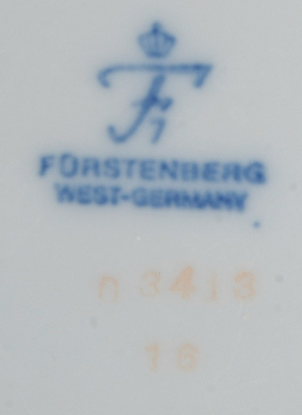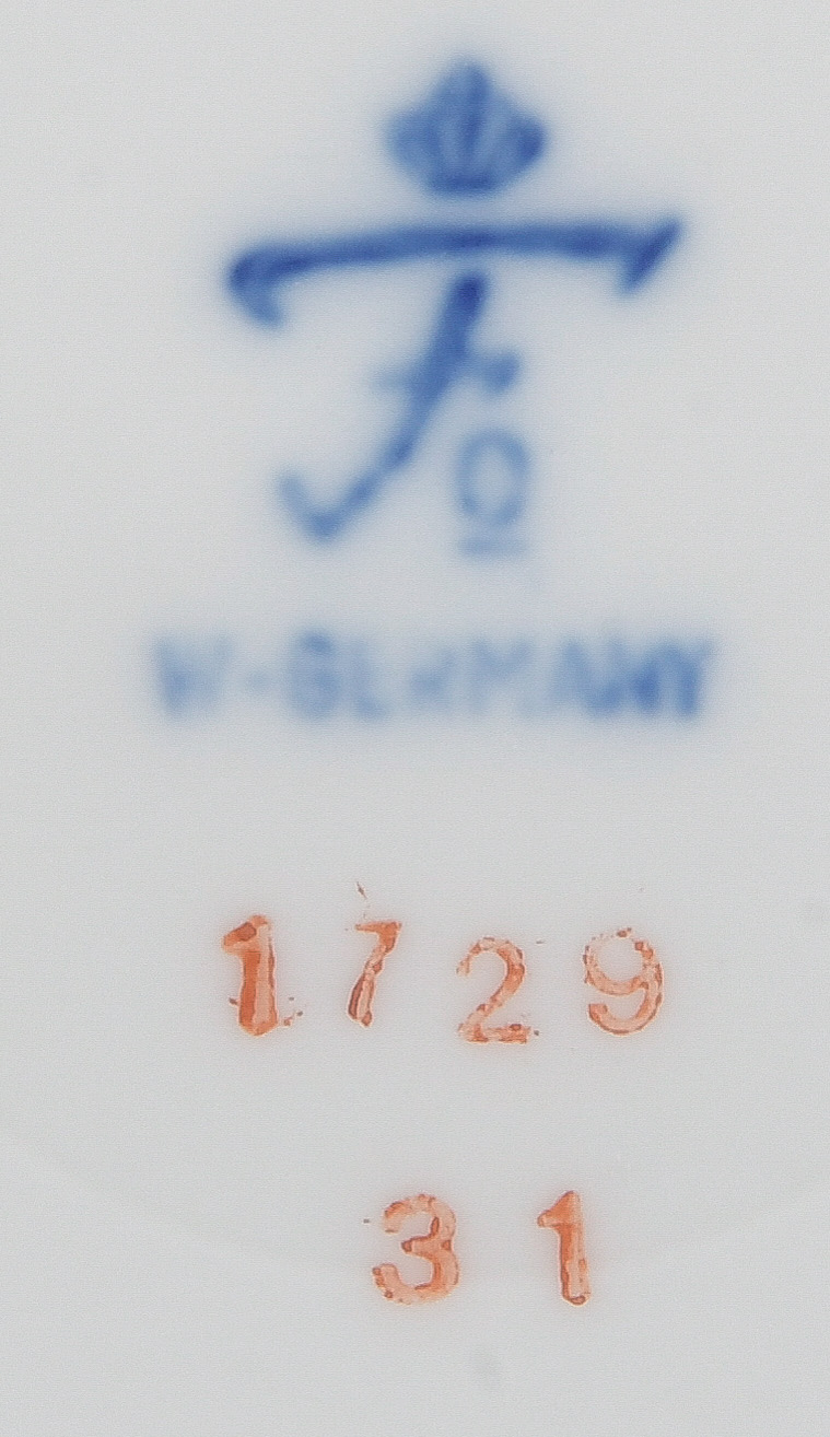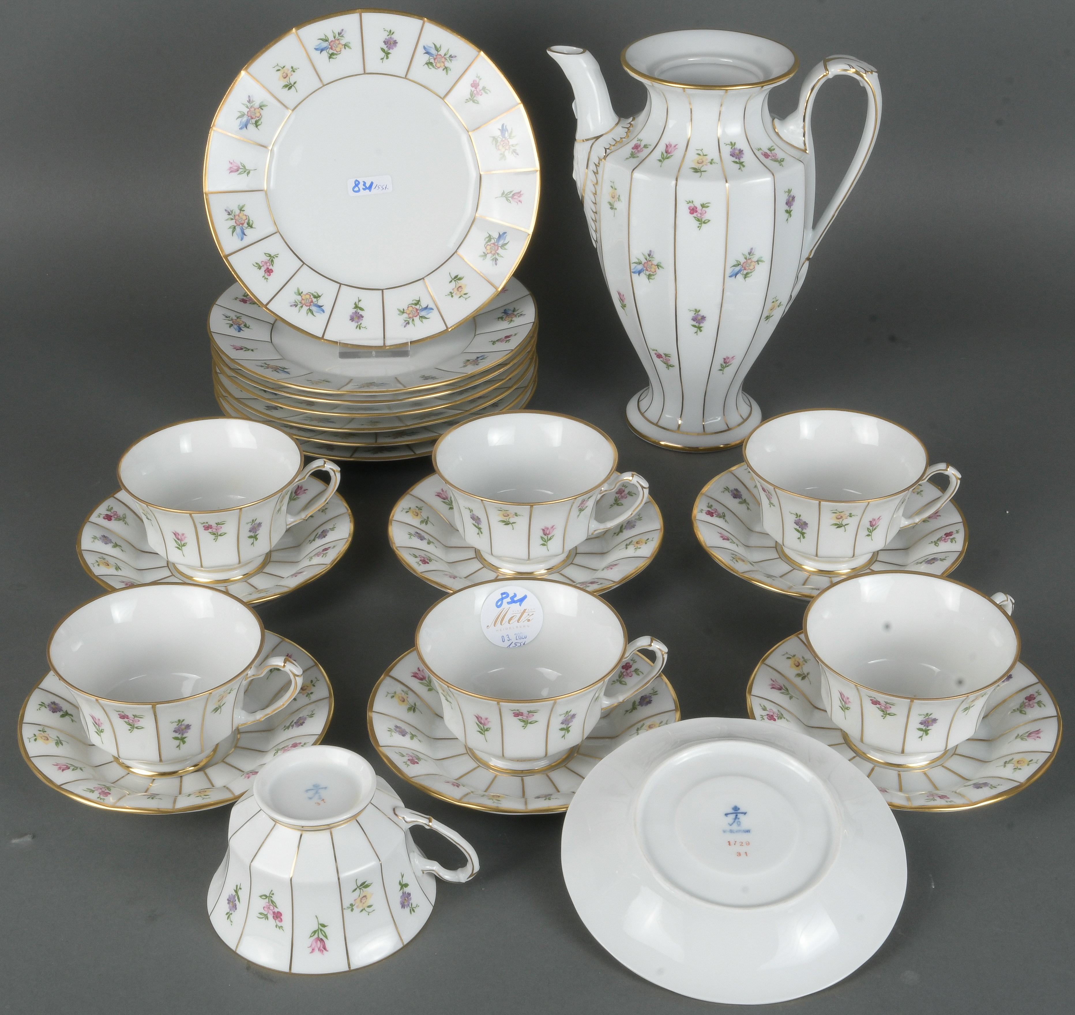 - Katalog-Nr: 83115-tlgs. Kaffeeservice. Fürstenberg 20. Jh. Porzellan, bunt bemalt mit Floraldekor, gold gesäumt. Bestehend aus: Eine Kanne ohne Deckel (H=22,5 cm), sieben Tassen mit Unterschalen und sieben Kuchenteller (D=je 19,5 cm).o.L.