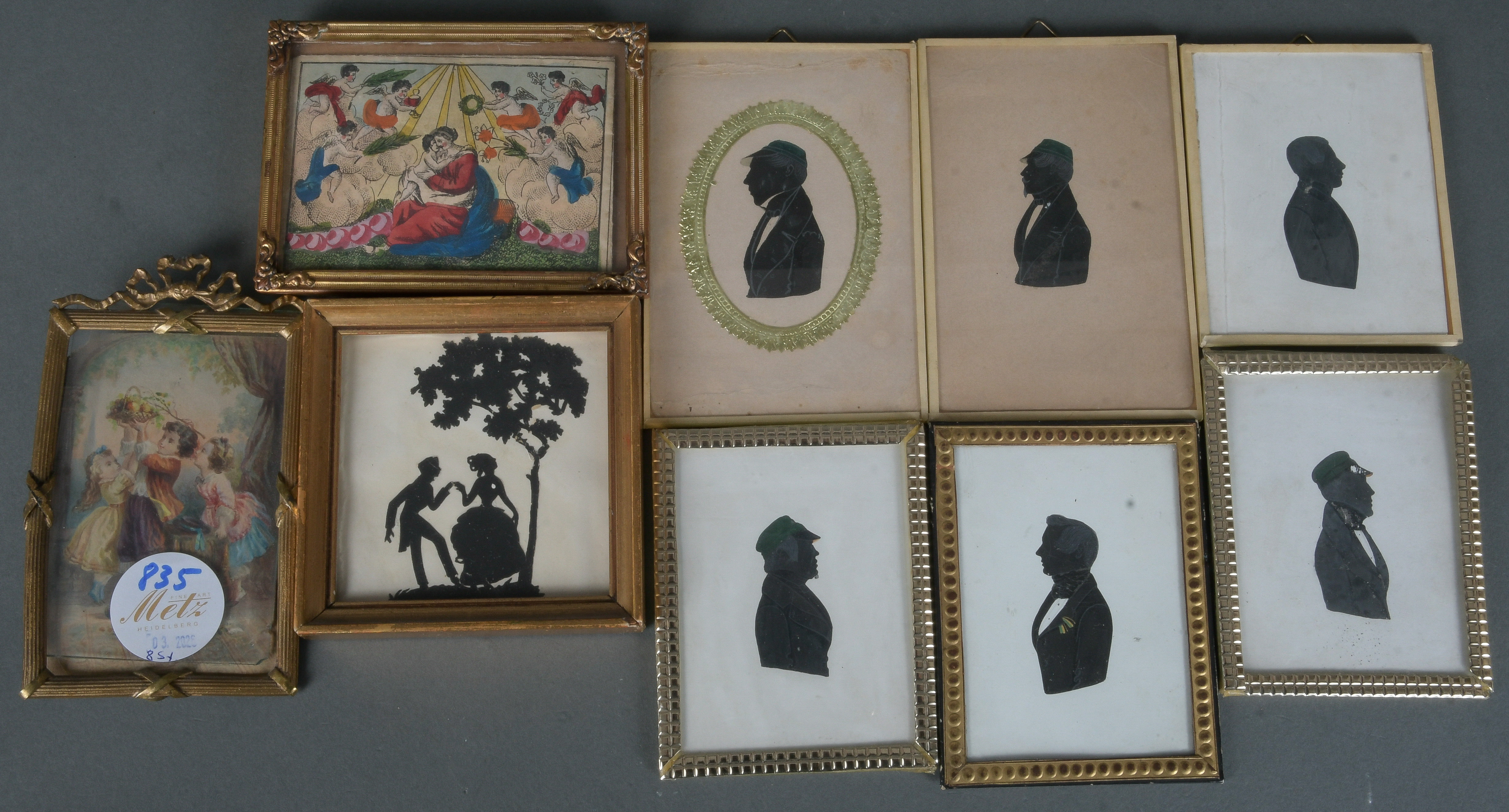 - Katalog-Nr: 835Neuntlgs. Konvolut Rahmen. Deutsch 20. Jh. Blech / Holz / Messing, teilw. verglast, mit Scherenschnitten bzw. Tuschfederzeichnungen, 7,5 x 8,2 bis 9,5 x 11,8 cm.o.L.