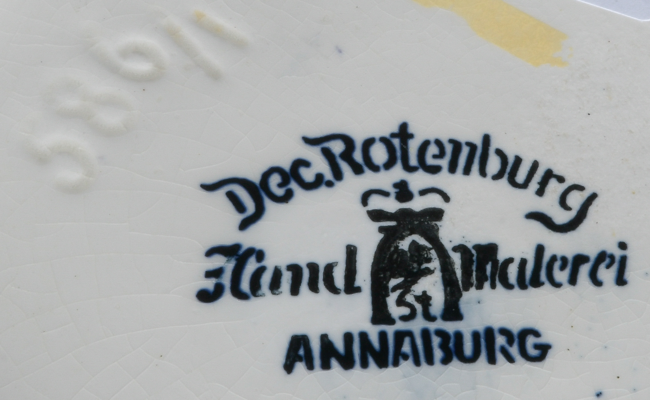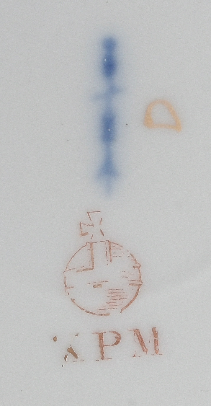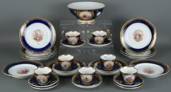 - Katalog-Nr: 850Bedeutendes 22-tlgs. Teilservice. Berlin um 1900. Porzellan, mit kobaltblauem Fond, Goldspitzenbordüren und -kartuschen. Reserven exzellent bunt bemalt mit Komödienszenerien in Landschaft; am Boden unterglasurblaue Szeptermarke mit braunem KPM und Reichsapfel. Bestehend aus: Elf Teller (D=je 21 cm), eine runde Kumme (H=10 cm, D=23 cm) und sieben Tassen mit zehn Unterschalen.o.L.