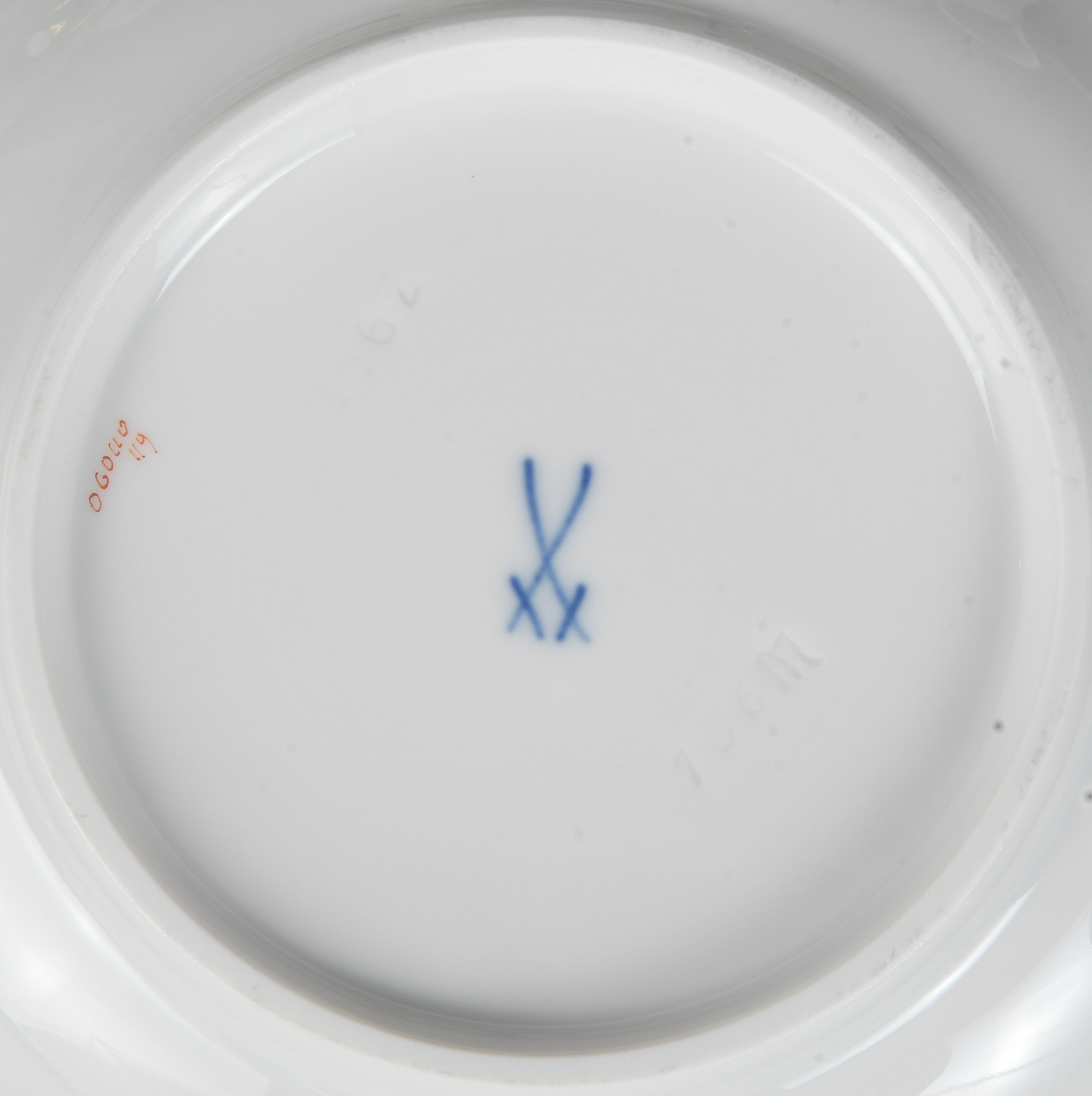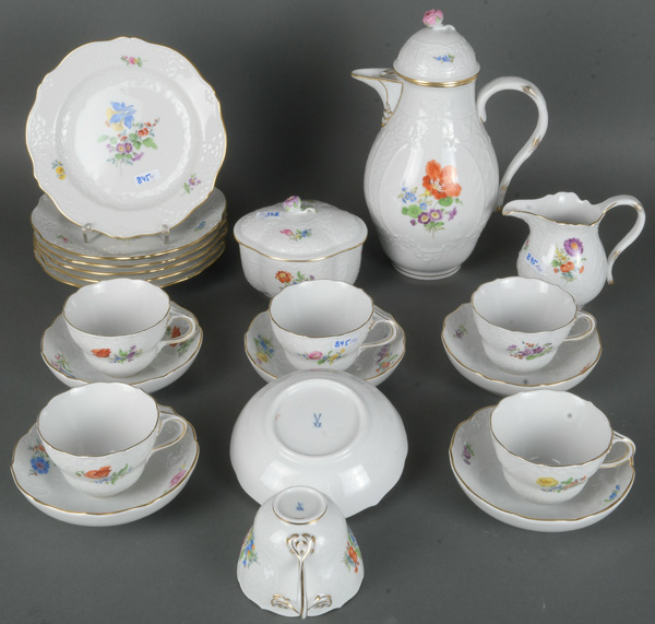 - Katalog-Nr: 84515-tlgs. Kaffeeservice „Ozierrelief“. Meissen 20. Jh. Porzellan, bunt bemalt mit Floraldekor, Goldrand; am Boden unterglasurblaue Schwertermarke. Bestehend aus: Eine Kaffeekanne (H=25,5 cm), ein Milchgießer (H=11,5 cm), eine Zuckerdose (H=9,5 cm), sechs Tassen mit Unterschalen und sechs Kuchenteller (D=je 18,8 cm).o.L.