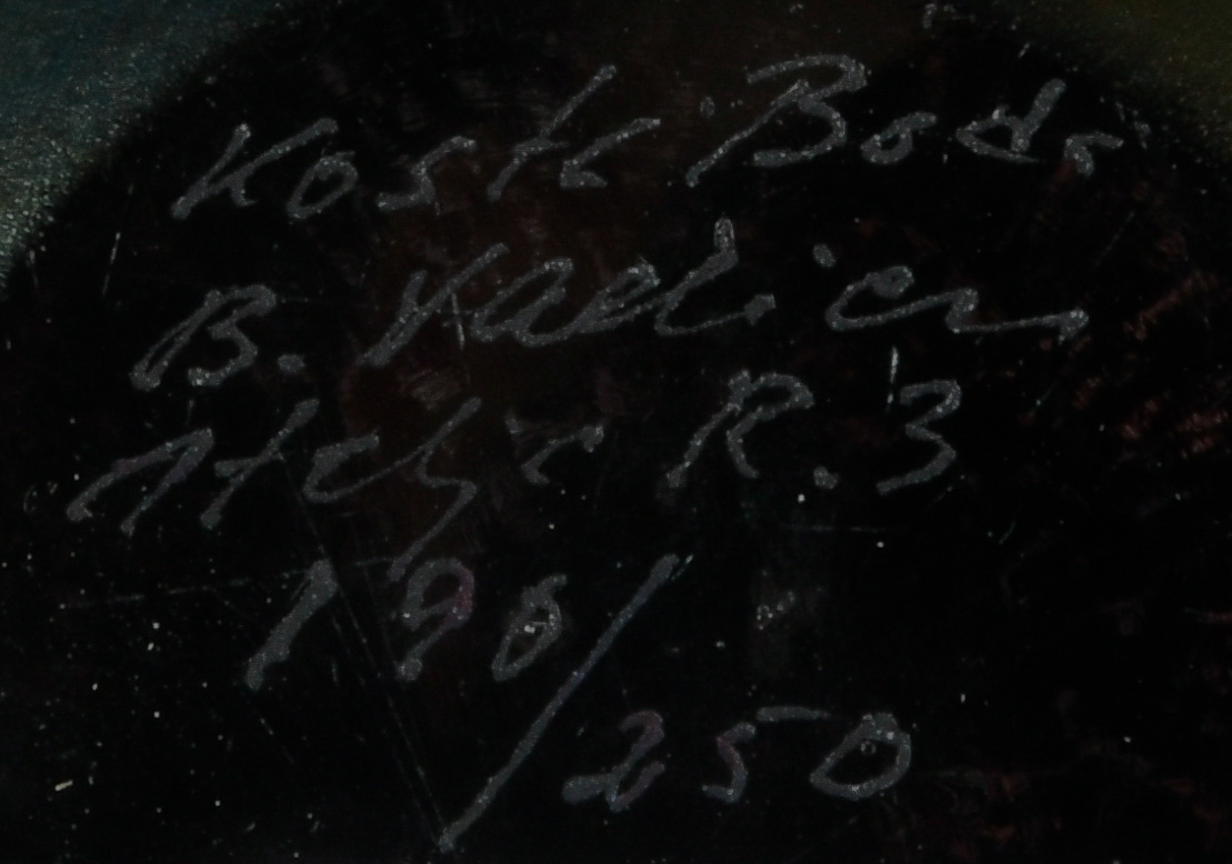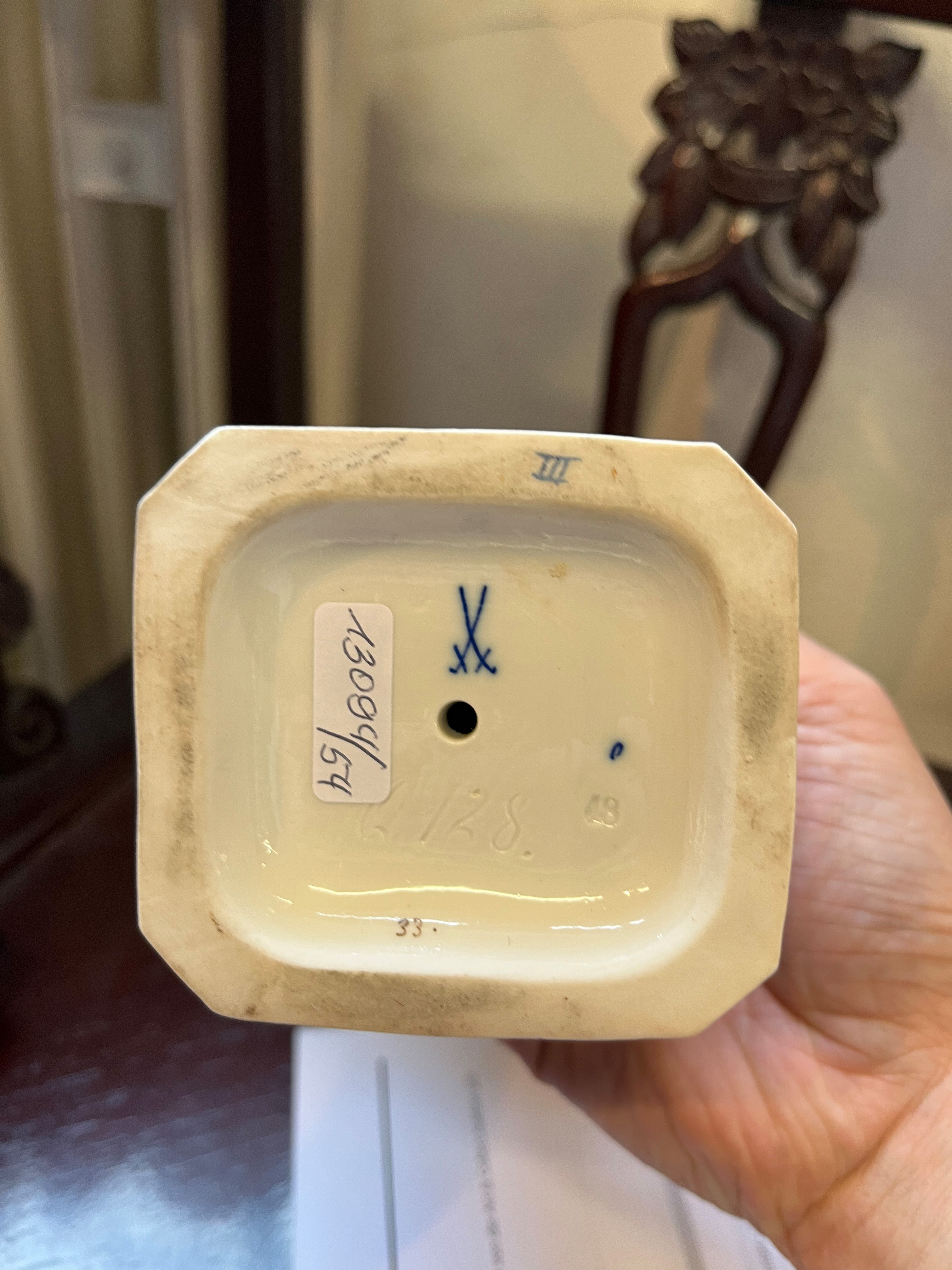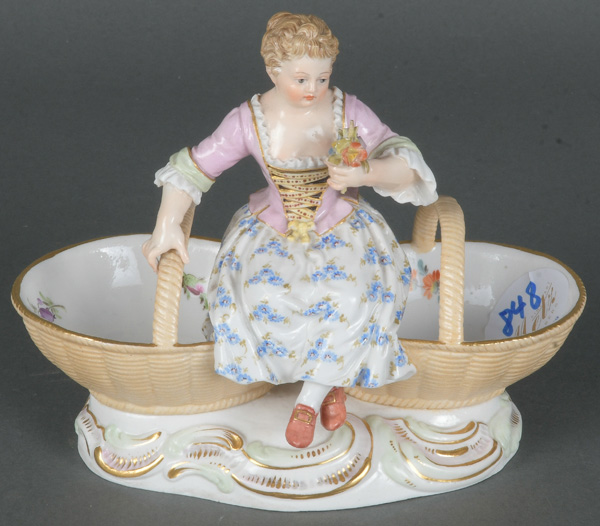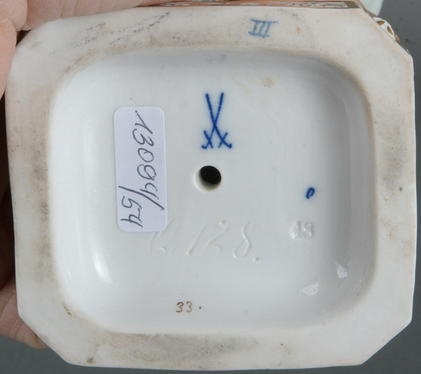 - Katalog-Nr: 848Gewürzschale. Meissen 19. Jh. Porzellan, bunt bemalt mit Streublumen; am Boden unterglasurblaue Schwertermarke. Modell nach Johann Joachim Kaendler, H=12,4 cm. (min. best.)o.L.