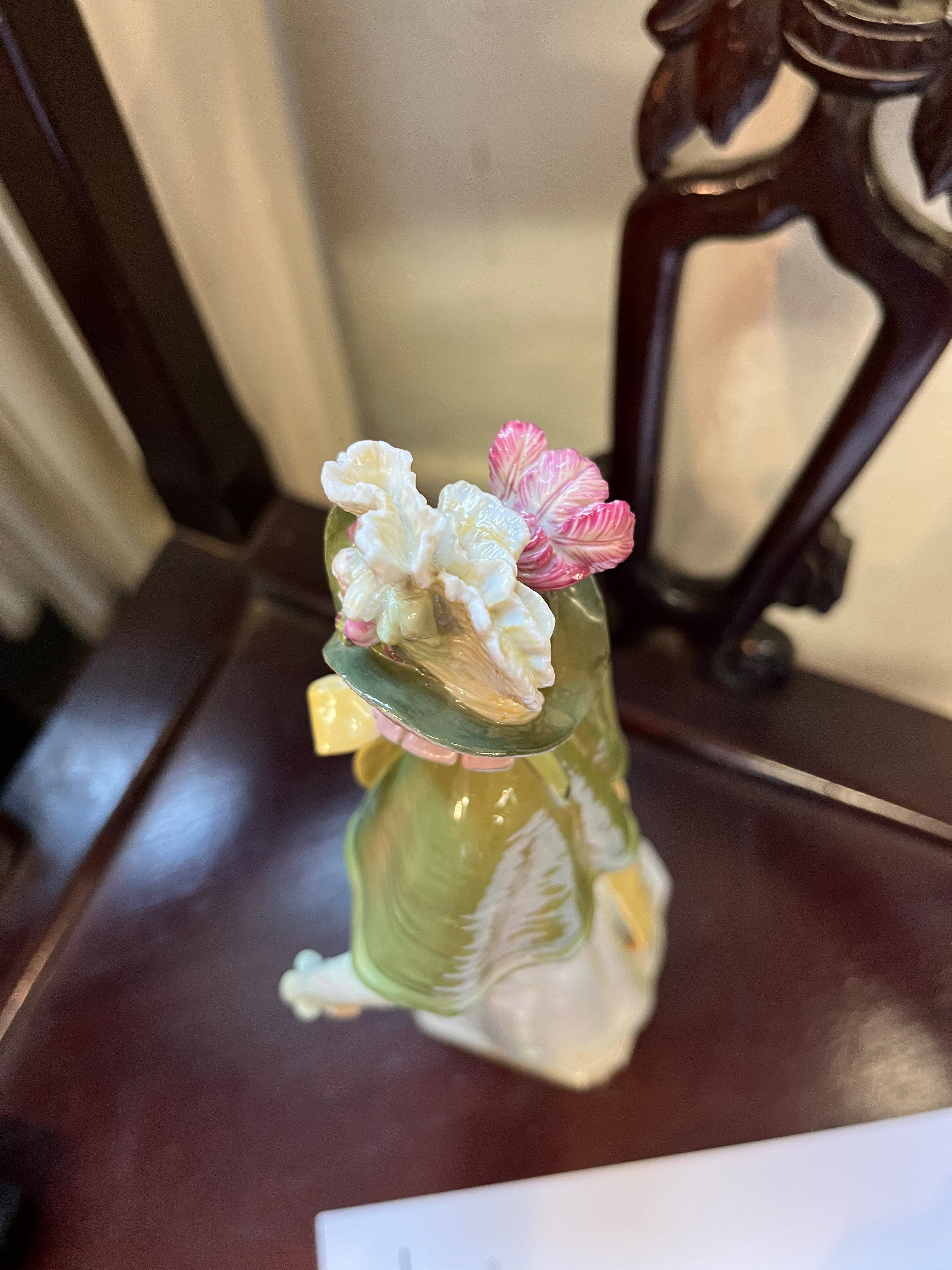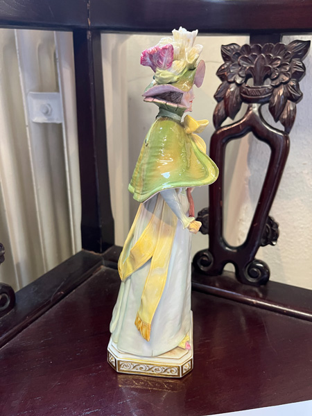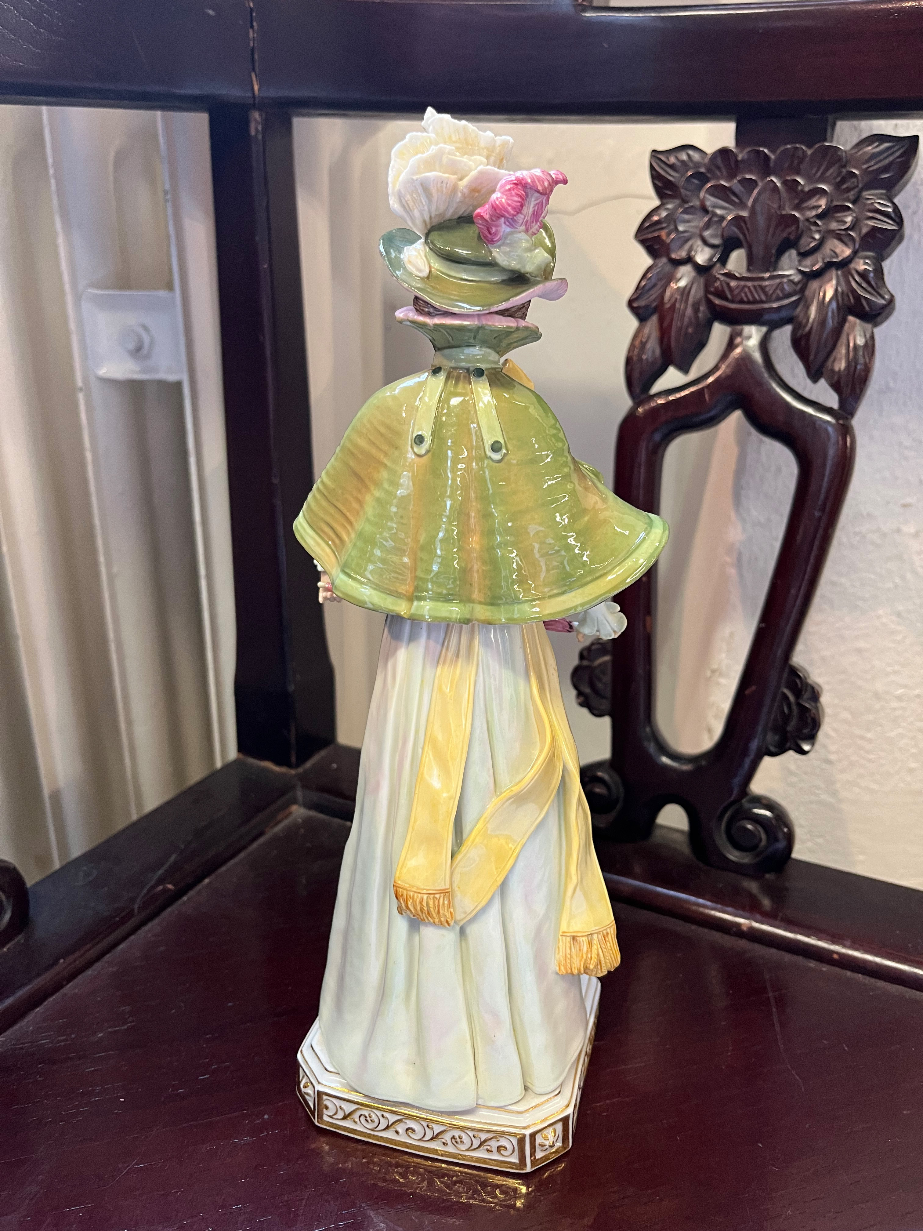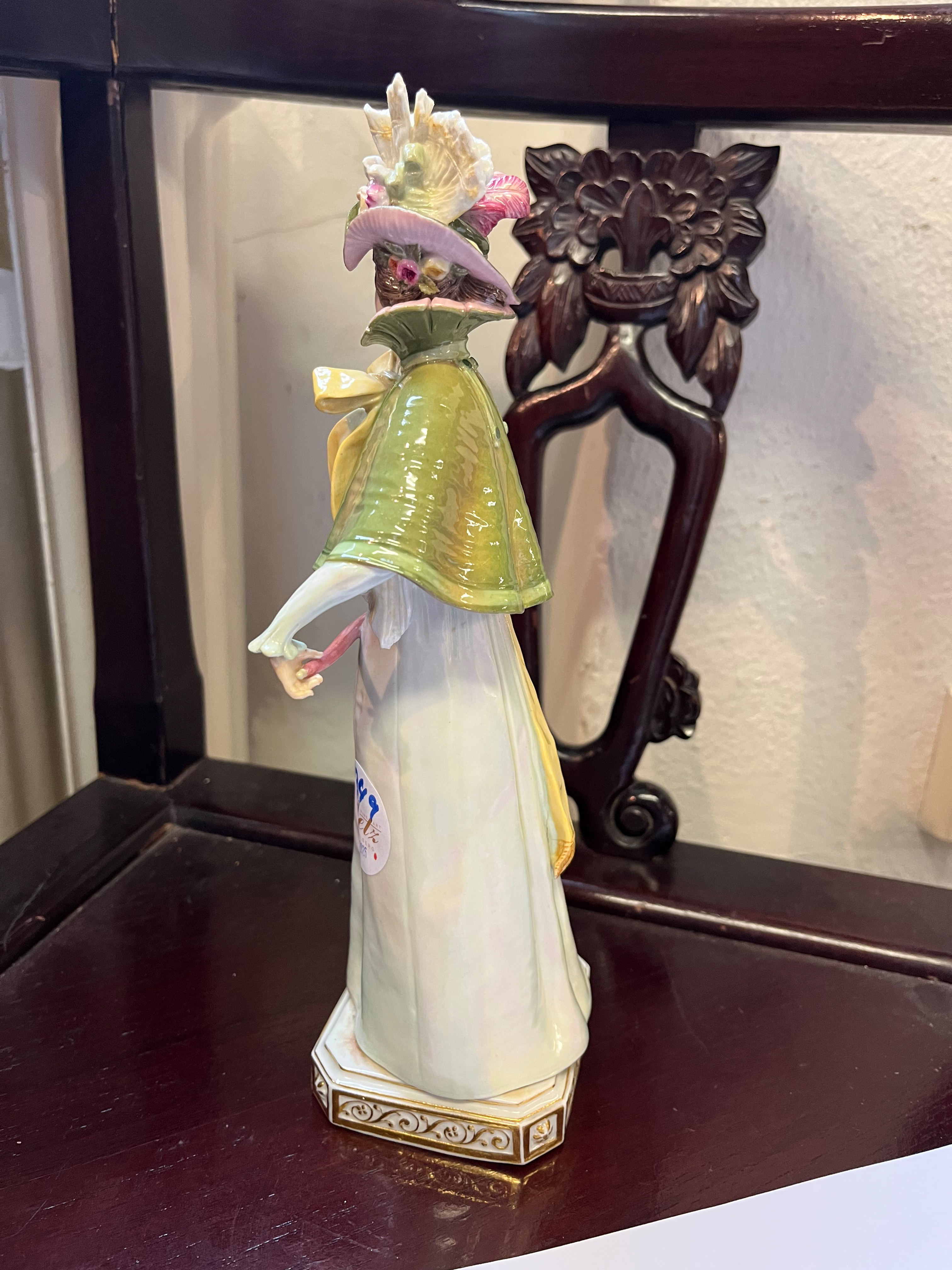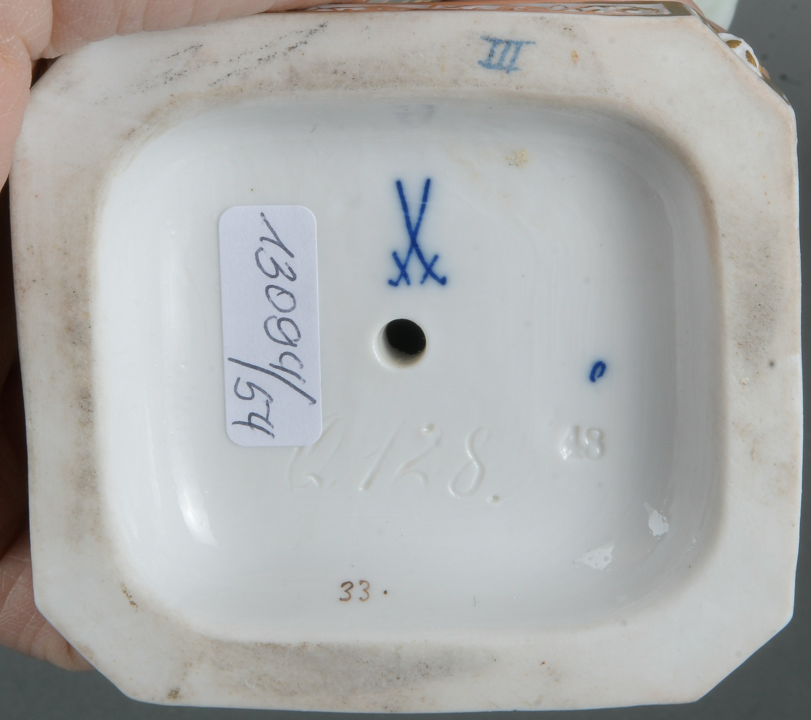 - Katalog-Nr: 849Dame mit Schirm. Meissen 1896. Stehend auf oktogonalem Reliefsockel, gold gesäumt. Porzellan, bunt bemalt, am Boden unterglasurblaue Schwertermarke, Formnummer „Q 128“, Staffiererziffer „33.“, Entwurf von Robert Schirmer, H=25,5 cm.o.L.